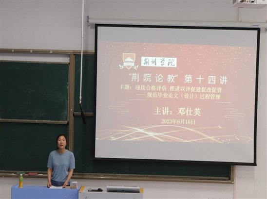 本网讯(通讯员 陈雯 李浩晗)为全面提升全体教师本科教学工作“合格评估”思想认识,我校“荆院论教”平台开辟以“迎接合格评估,推进以评促建促改促管(简称‘一评三促’)”为主题的系列专题讲座。6月16日下午在3105教室举办“规范毕业论文(设计)过程管理”专题讲座(“荆院论教”14讲),特邀请我校健康学院/材料与化工学院邓仕英副院长作专题报告。副校长柴兴泉,教务处、人事处、分院教学院长、自有专任教师、教学秘书等参加,教促办主任李克华主持。