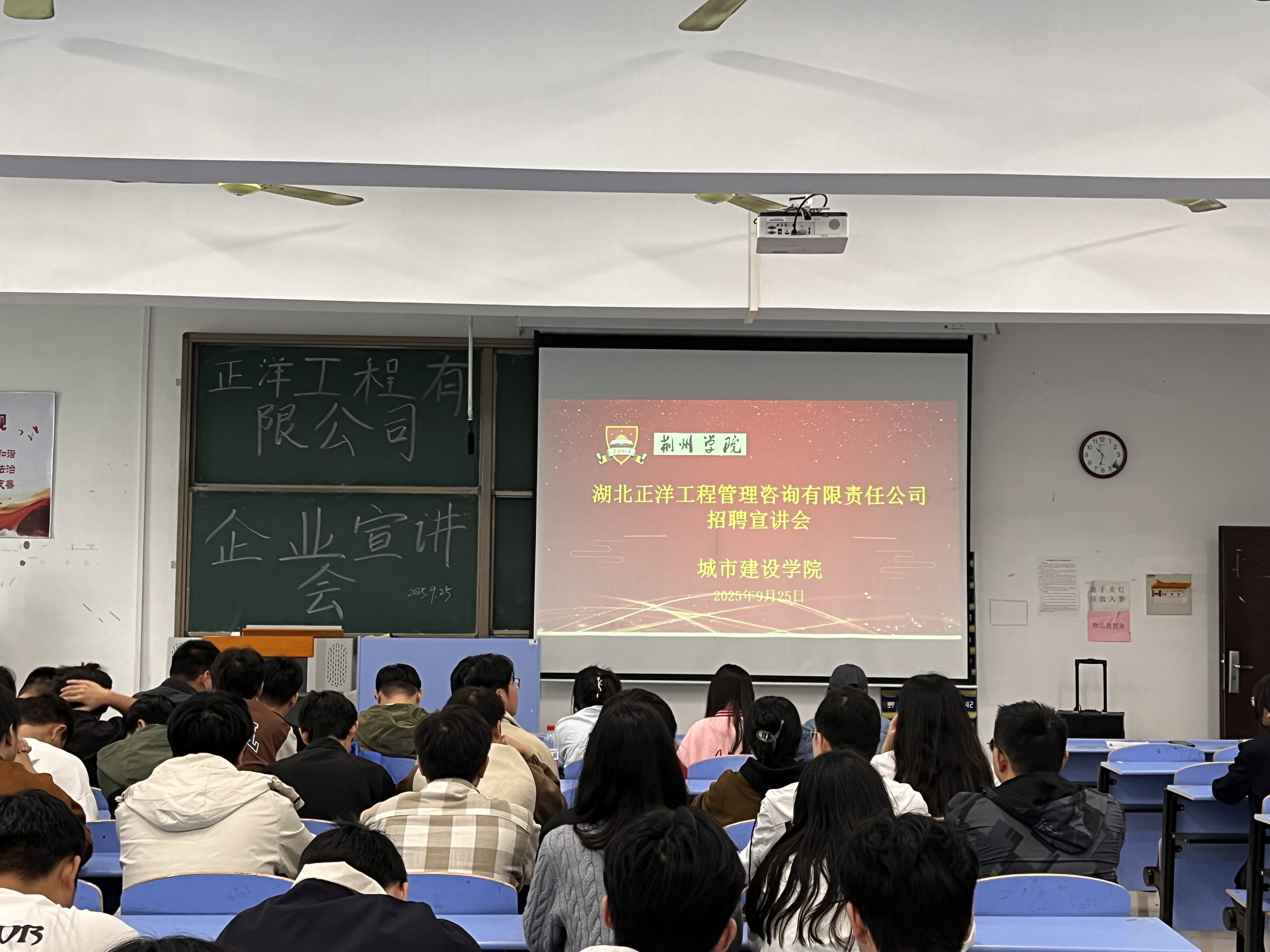 为进一步拓宽毕业生就业渠道,帮助同学们更好地了解行业发展动态,明确职业规划方向,9月25日上午10点30分,城市建设学院邀请了正洋工程管理有限公司走进校园,举办了一场别开生面的企业宣讲会。本次活动不仅让同学们深入了解了企业的发展历程与用人理念,也为即将踏入社会的毕业生提供了就业机会。