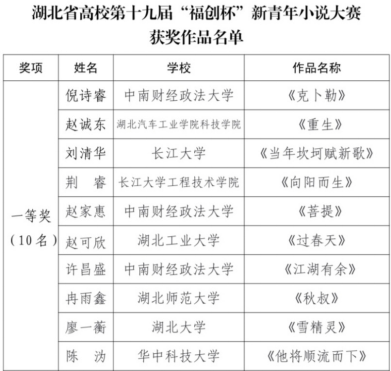 本网讯(通讯员 张沁)近日,由湖北省作家协会、湖北省学生联合会、湖北大学主办,共青团湖北大学委员会承办的第十九届“福创杯”新青年小说大赛公布了获奖名单,城市建设学院造价61901班荆睿的短篇小说《向阳而生》荣获一等奖,19级辅导员史会平荣获优秀指导教师称号。