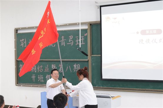 造价62101班勾志媛同学作为第八期青马班学员代表从马克思主义学院院长、青马班班主任胡兆凌手中接过“青马班”旗帜。