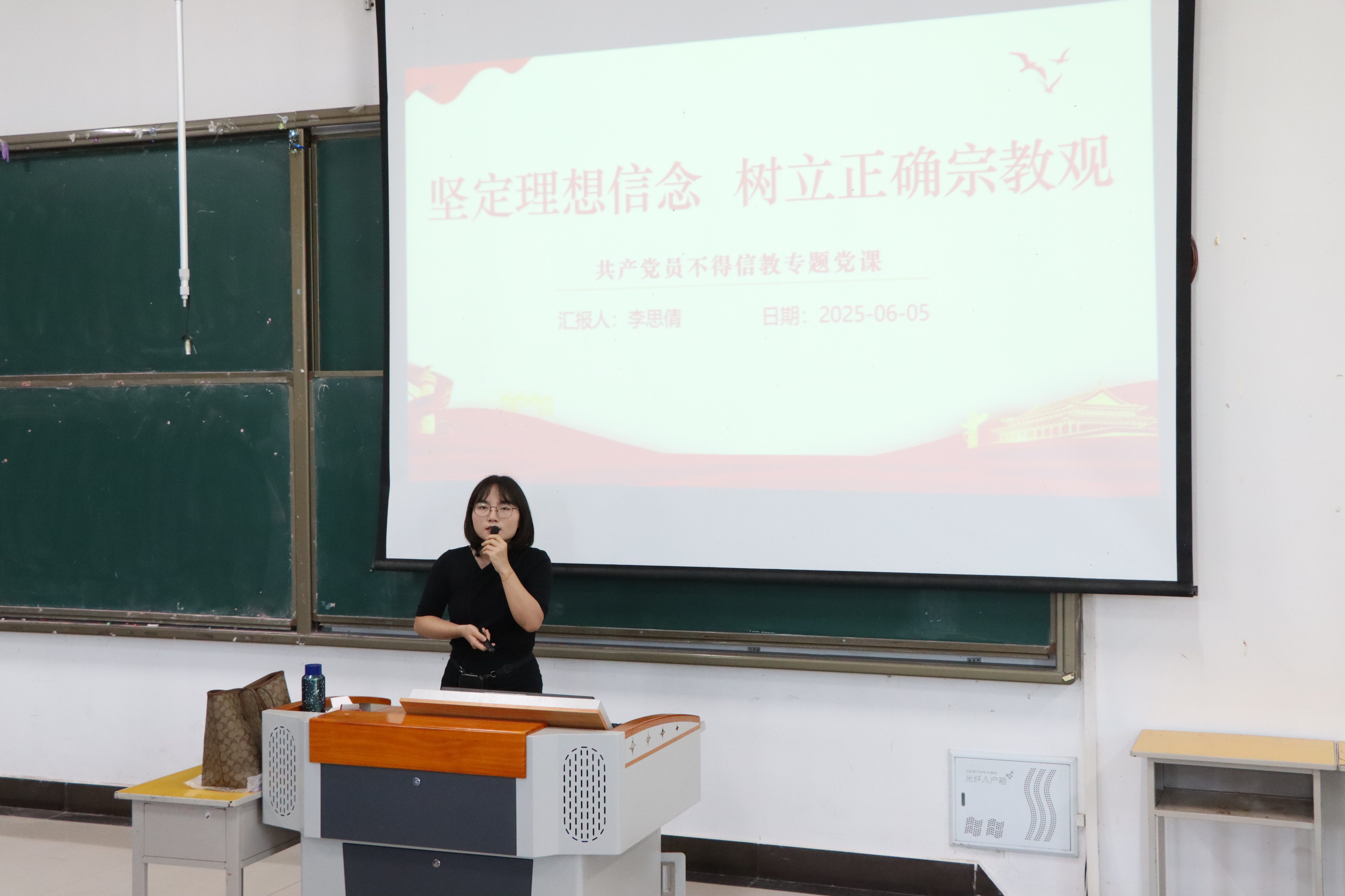 马克思主义学院专任教师李思倩“共产党员不得信仰宗教”为主题,分别从共产党员不准信仰宗教是共产党的一贯原则、允许党员信教将侵蚀涣散党的肌体、加强马克思主义宗教观和无神论和向校园传教坚决说不四个方面阐述了共产党员为什么不能信仰宗教以及在日常工作生活中如何坚守不信宗教的政治纪律,教育全体党员干部、青年党员学生时刻严守不信教、不传教的政治纪律,进一步坚定理想信念、增强党性观念。