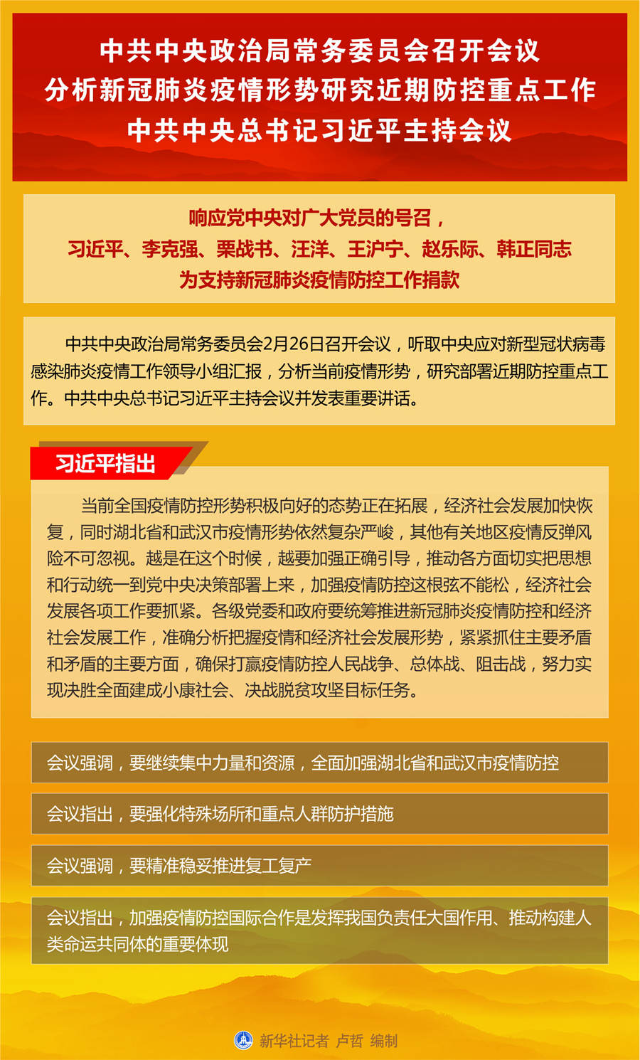 新华社北京2月26日电 中共中央政治局常务委员会2月26日召开会议,听取中央应对新型冠状病毒感染肺炎疫情工作领导小组汇报,分析当前疫情形势,研究部署近期防控重点工作。中共中央总书记习近平主持会议并发表重要讲话。