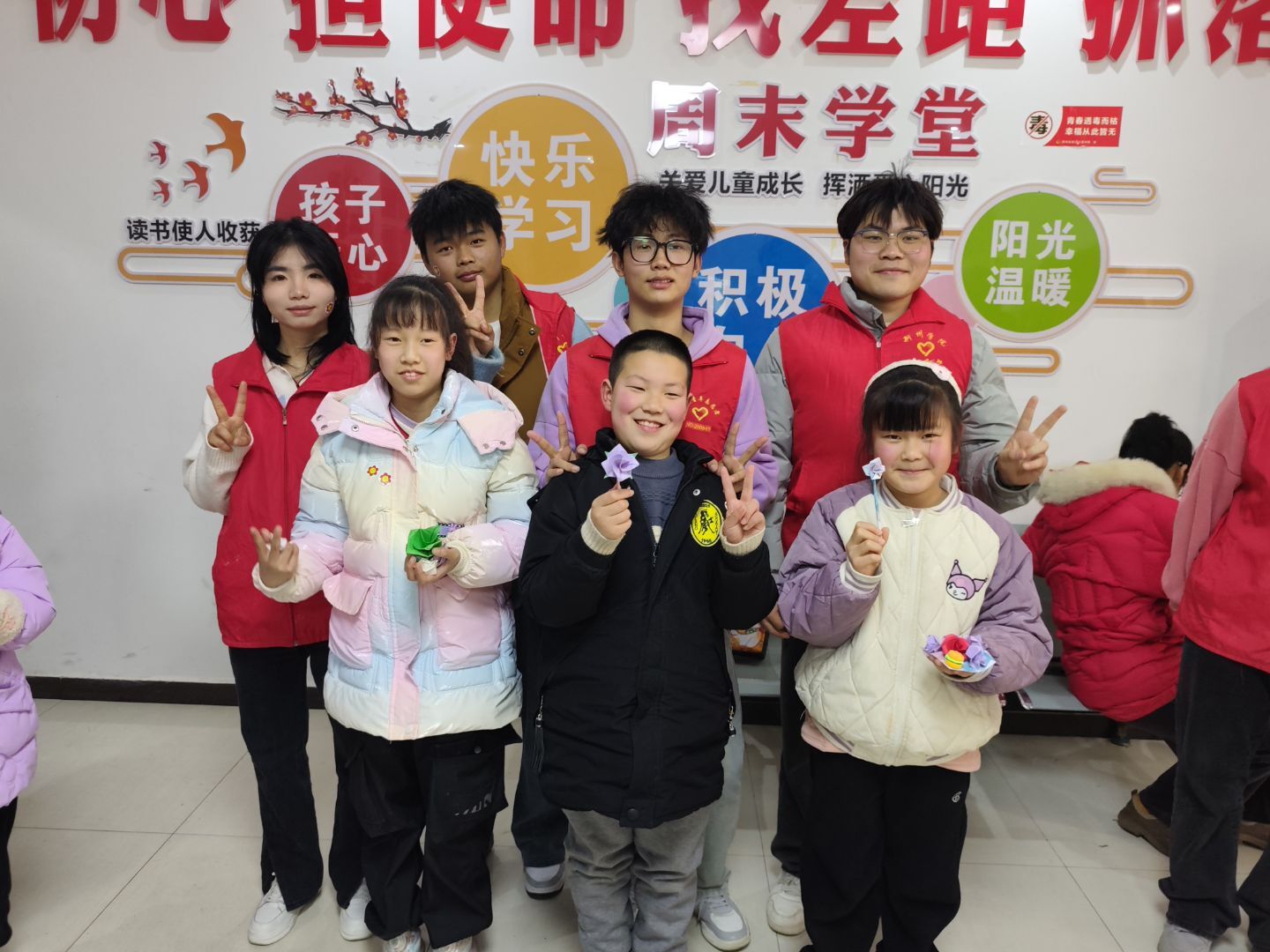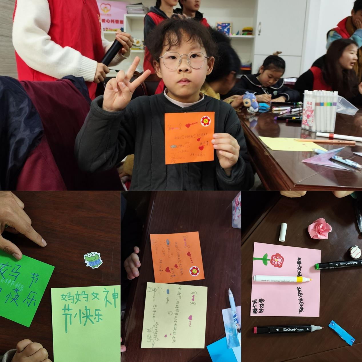 随后,志愿者通过“切水果”小游戏迅速拉近了与孩子们的距离。紧接着,手工课环节开启,一张彩纸、一把剪刀,在志愿者的指导下,孩子们充分发挥想象力,创作出一件件充满童趣的作品,有可爱的小动物,也有五彩的花朵,每一件都承载着他们的快乐与创意。