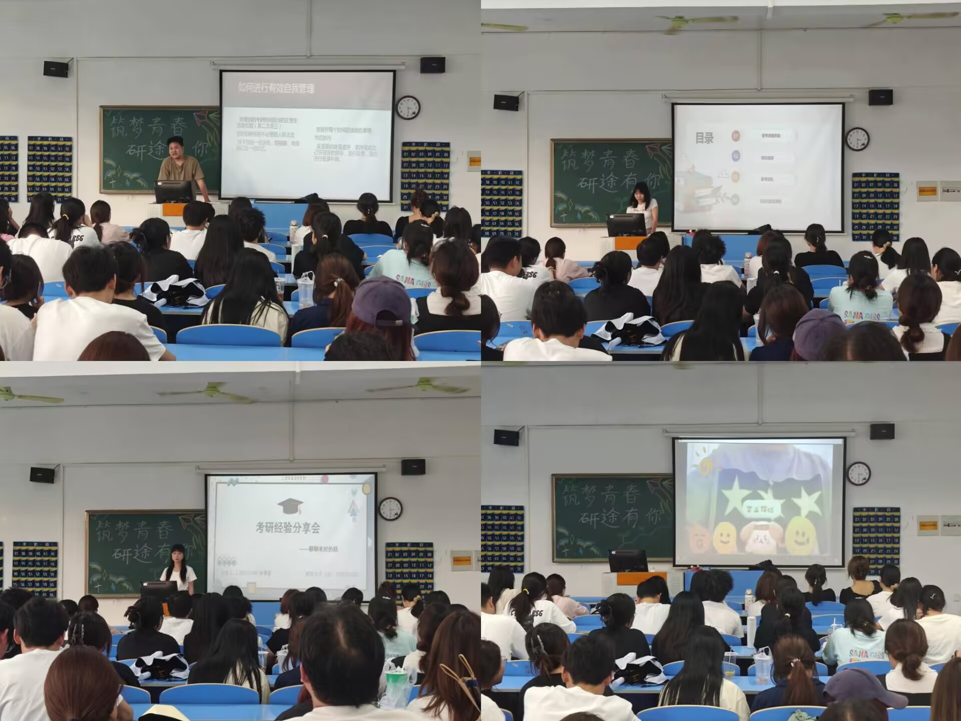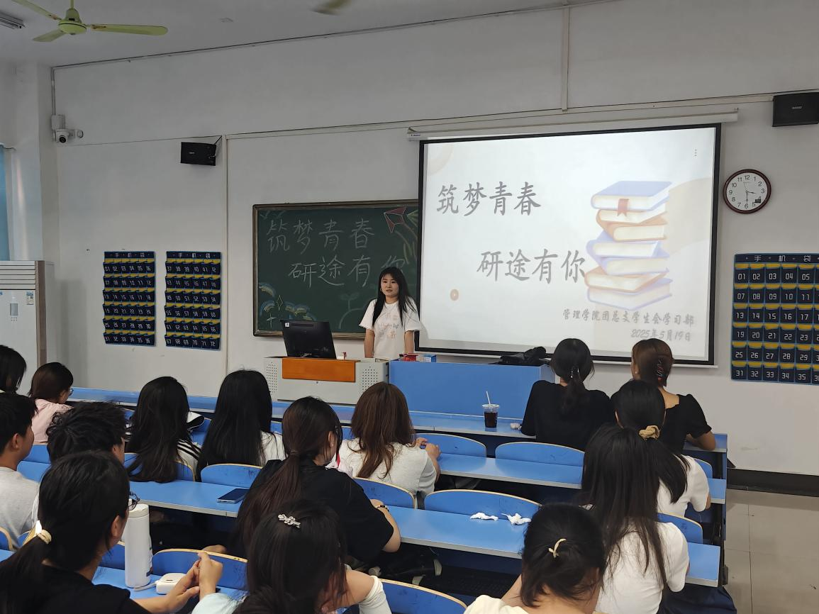 本网讯(通讯员:付荆京)为帮助同学们更好地备战考研,明确复习方向,掌握高效备考方法,管理学院于5月19日晚在6406教室召开2026届考研复习备考分享会。本次分享会邀请了管理学院辅导员樊冰璐老师、工商62103李亚学姐、徐慧敏学姐、电商62101李婉婷学姐、工商62101彭劲学长,他们结合自己的备考经历,为同学们提供了宝贵的经验和建议。