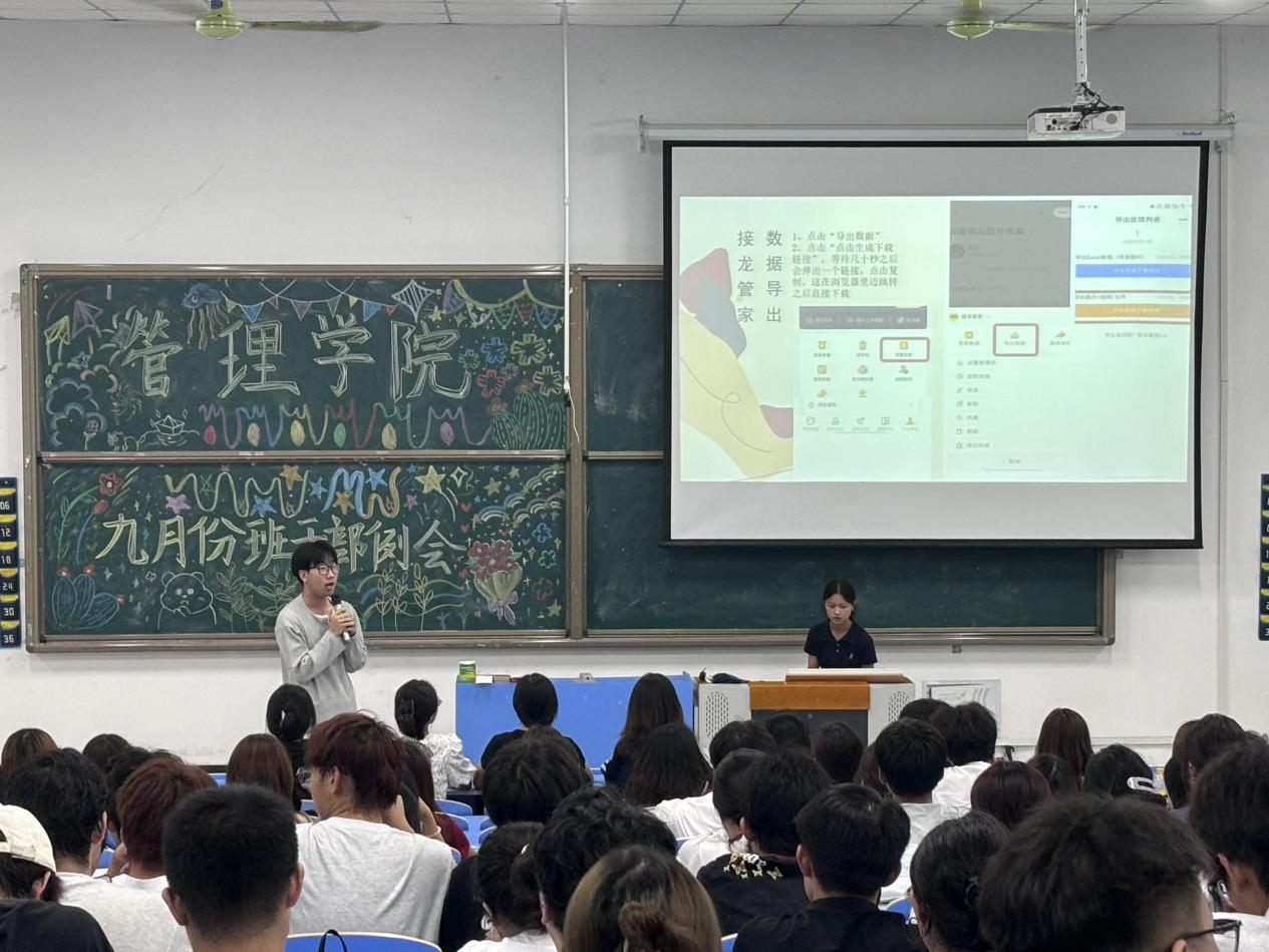 本网讯(通讯员:皮兰朵)为进一步优化班级管理工作,凝聚班干部团队力量,明确下一阶段工作方向,管理学院于9月28日晚在5405教室召开九月份班干部例会,学生第二党支部书记毛佳宁及各班班委参加了本次会议。