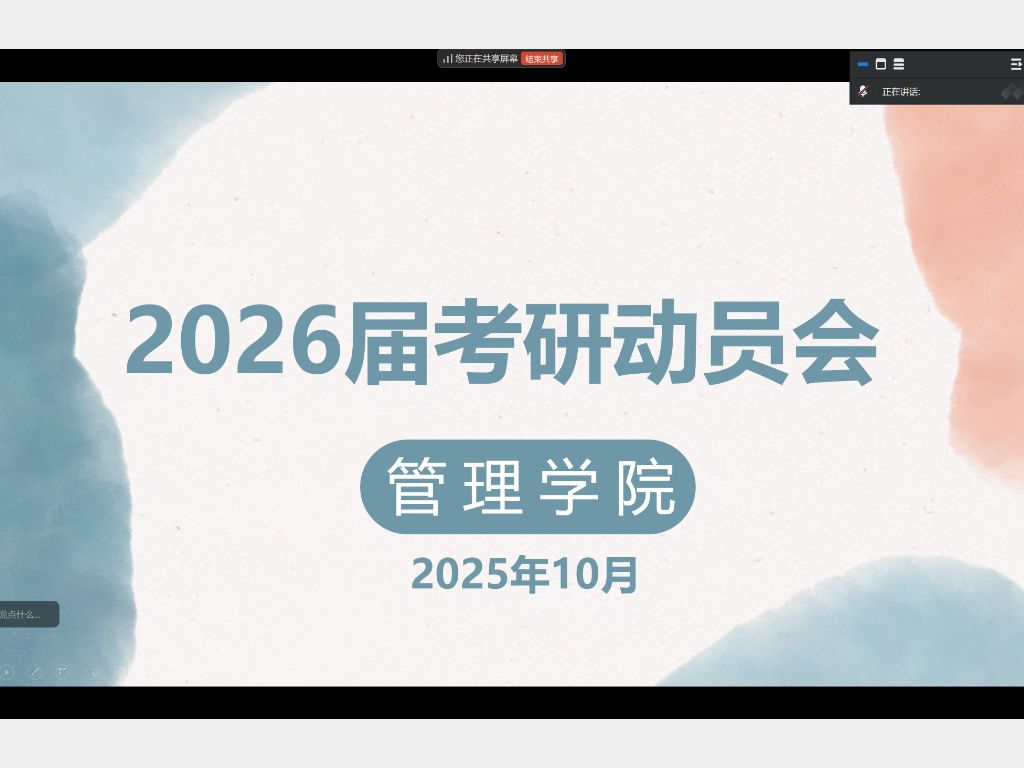 本网讯(通讯员:李士豪)为进一步激发2026届毕业生考研斗志、明晰备考方向,帮助学生深入了解考研的现状和形势,管理学院于10月13日下午召开2026届毕业生考研线上动员大会。会议由管理学院团总支书记季诚老师、学生第一党支部书记关婧瑶老师共同主持。