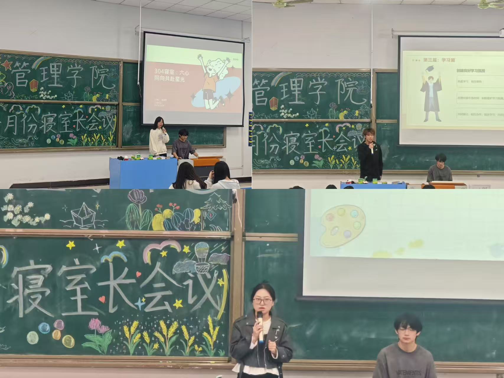 本网讯(通讯员:朱记双)为强化宿舍精细化管理效能,培育宿舍文明新风,扎实筑牢宿舍安全卫生防线,构建温馨友爱的集体生活环境。管理学院于10月29日晚在5405教室召开10月份寝室长会议。出席本次会议的有学院学生第一党支部书记关婧瑶、团总支学生会主席团成员以及全体25级寝室长。