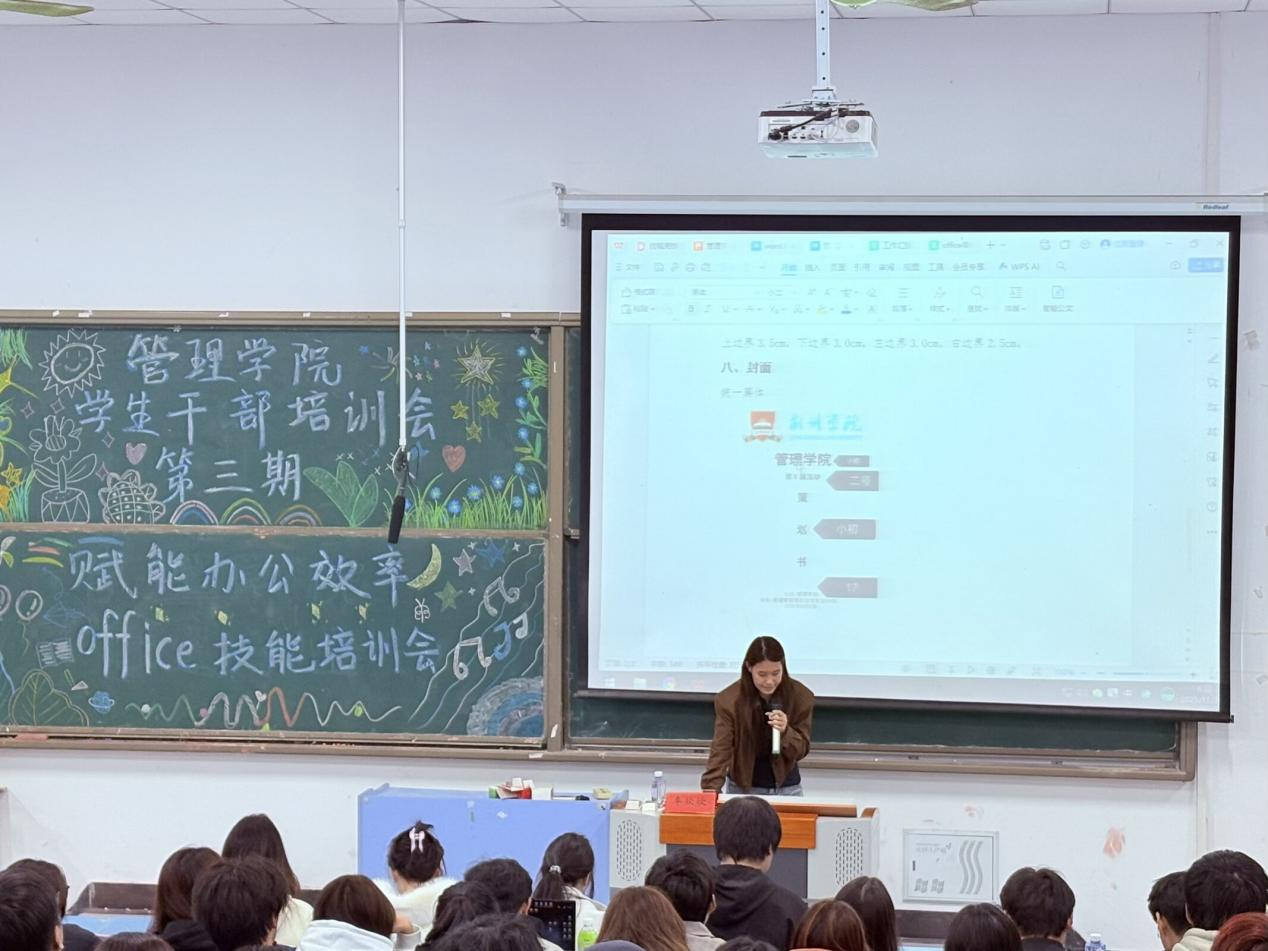 本网讯(通讯员:张韩)为提高学生会各部门学生干部的office应用能力,提升工作效率与工作质量,管理学院于11月24日晚在3405教室召开office技能培训会。本次培训会由学生会副主席车欣欣学姐主讲,学生会全体成员共同参与。