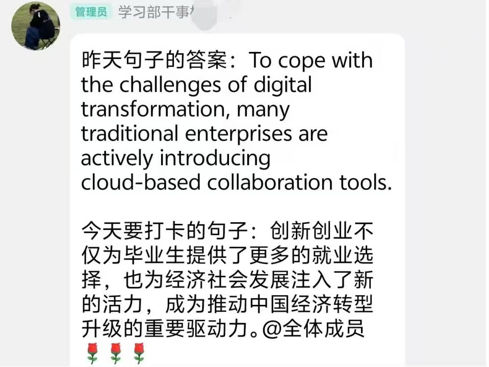 活动期间,学习部每日在活动群内推送一个四六级高频写作句型,内容涵盖数字经济、创新创业等热点主题,并附上参考译文,帮助同学们理解掌握。参与者通过“手写摘抄+线上提交”相结合的方式进行打卡,随后通过“接龙管家”小程序上传照片完成当日打卡记录。据统计,全程坚持打卡的同学占比超过八成,提交的打卡作品中不乏对句型的举一反三和个人化注解。许多同学反馈,通过十天有规律地积累,不仅掌握了大量实用表达,更缓解了对写作的畏难情绪,形成了主动学习、每日精进的习惯。