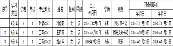 经过党支部对预备党员1年的培养教育和考察,经支部委员会研究确定,支部大会讨论决定,拟确定冯佳薇等3名同志预备党员转正,特在全院范围内进行公示。公示时间为2025年11月14日至2025年11月20日(7天)。