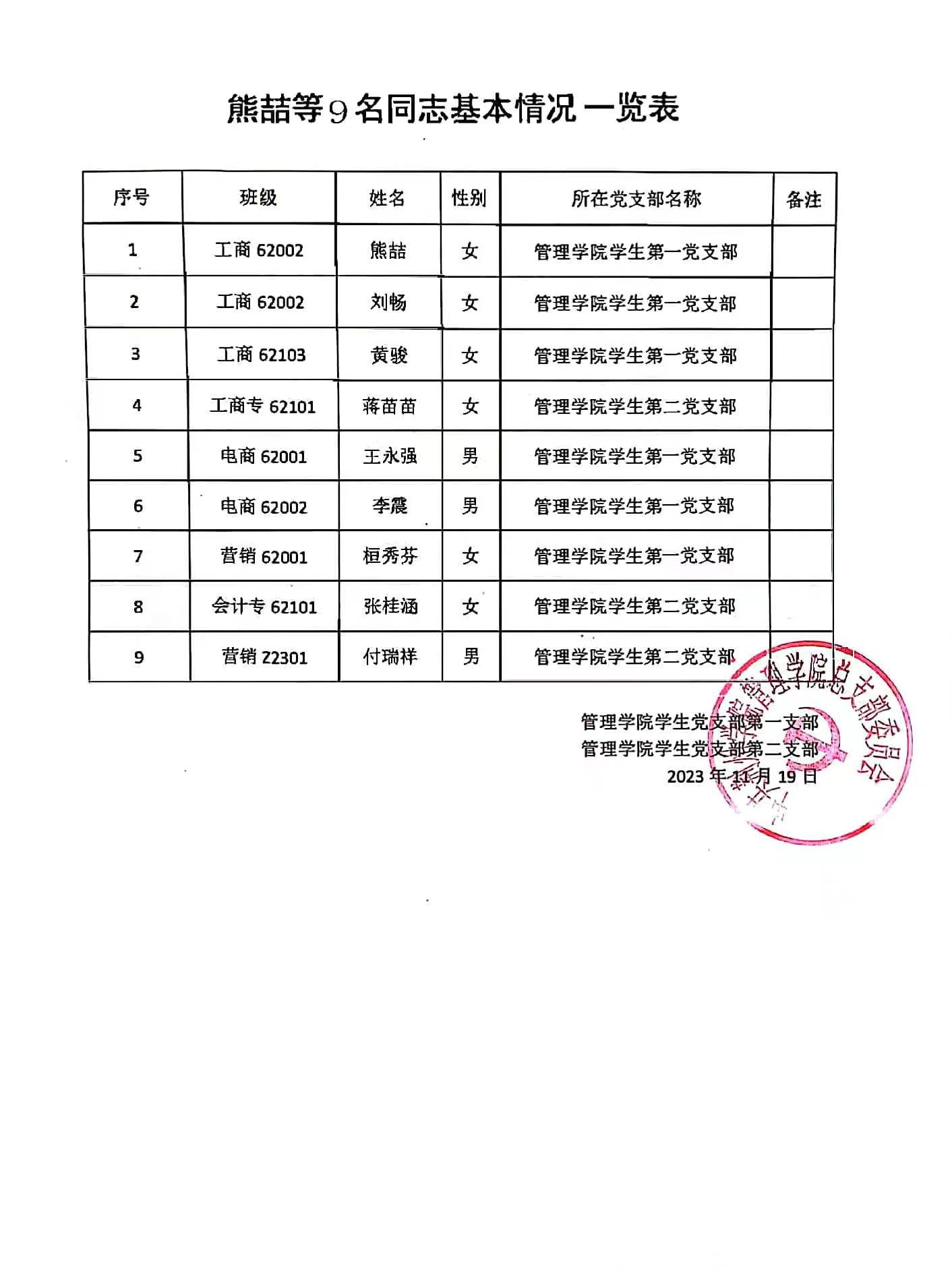 经过党支部对发展对象1年以上的培养教育和考察,经支部委员会研究确定,支部大会讨论决定,拟确定熊喆等9名同志预备党员转正,特在全院范围内进行公示。公示时间为2023年11月19日至2023年1月25日(7天)。