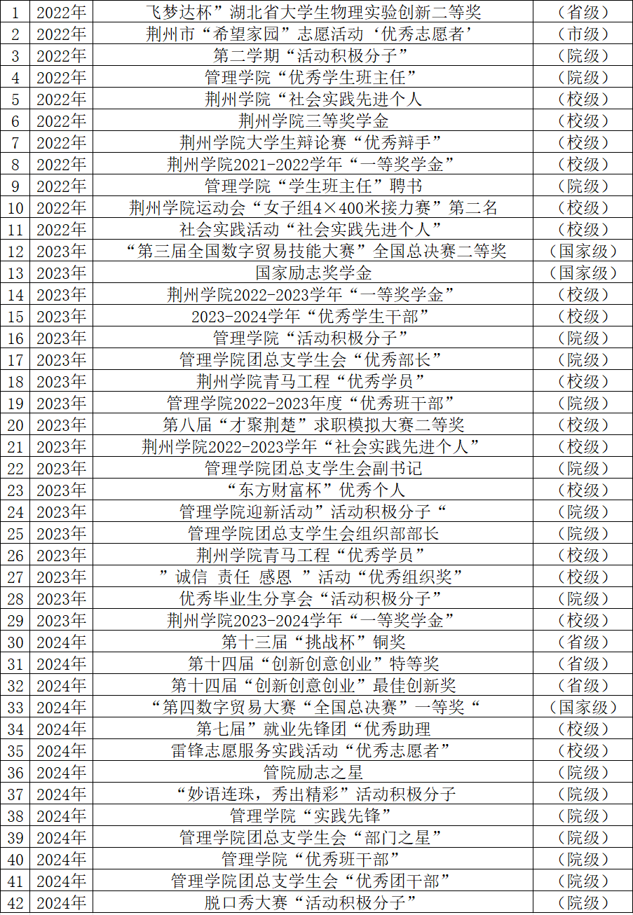 曾担任管理学院学生会组织部部长、22 级工商企业管理学生班主任、校辩队队长、演讲与辩论协会外联部部长、管理学院辩论队副队、管理学院团总支学生会副书记,现任工商 62103 班学习委员和就业处学生助理。