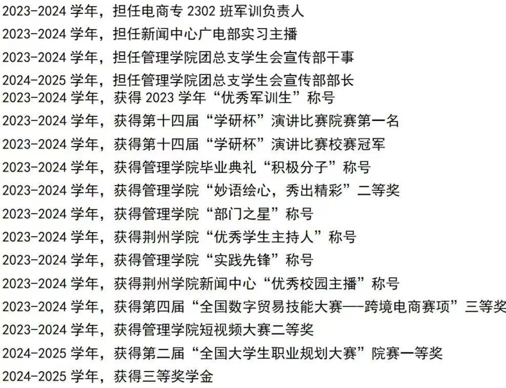 任职履历:曾担任新闻中心广电部实习主播、管理学院团总支学生会宣传部干事,现担任管理学院团总支学生会宣传部部长