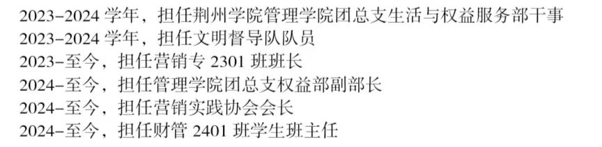 任职履历:曾任WilliamHill中文官方网站管理学院团总支生活与权益服务部干事、文明督导队队员。现任营销专2301班班长、管理学院团总支权益部副部长、营销实践协会会长、财管2401班学生班主任。