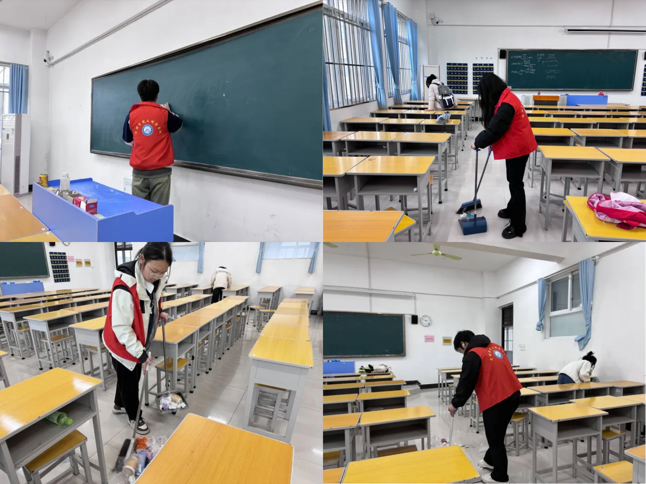 为给师生们营造一个清爽宜人的办公与学习环境,同学们准时集合于六栋教学楼前。在活动组织者的引导下,同学们很快便积极投入到对教室的清扫工作中去,共同为营造整洁的校园环境而努力着。同学们按部就班地进行着各项清扫工作,摆正桌椅、清理黑板、打扫垃圾等。在全体共同努力下,一个个教室不久就变得一尘不染。于忙碌之时,大家领略着劳动的意义与收获的欢快,同时也愈加珍视用这份努力所换来的干净的学习环境。