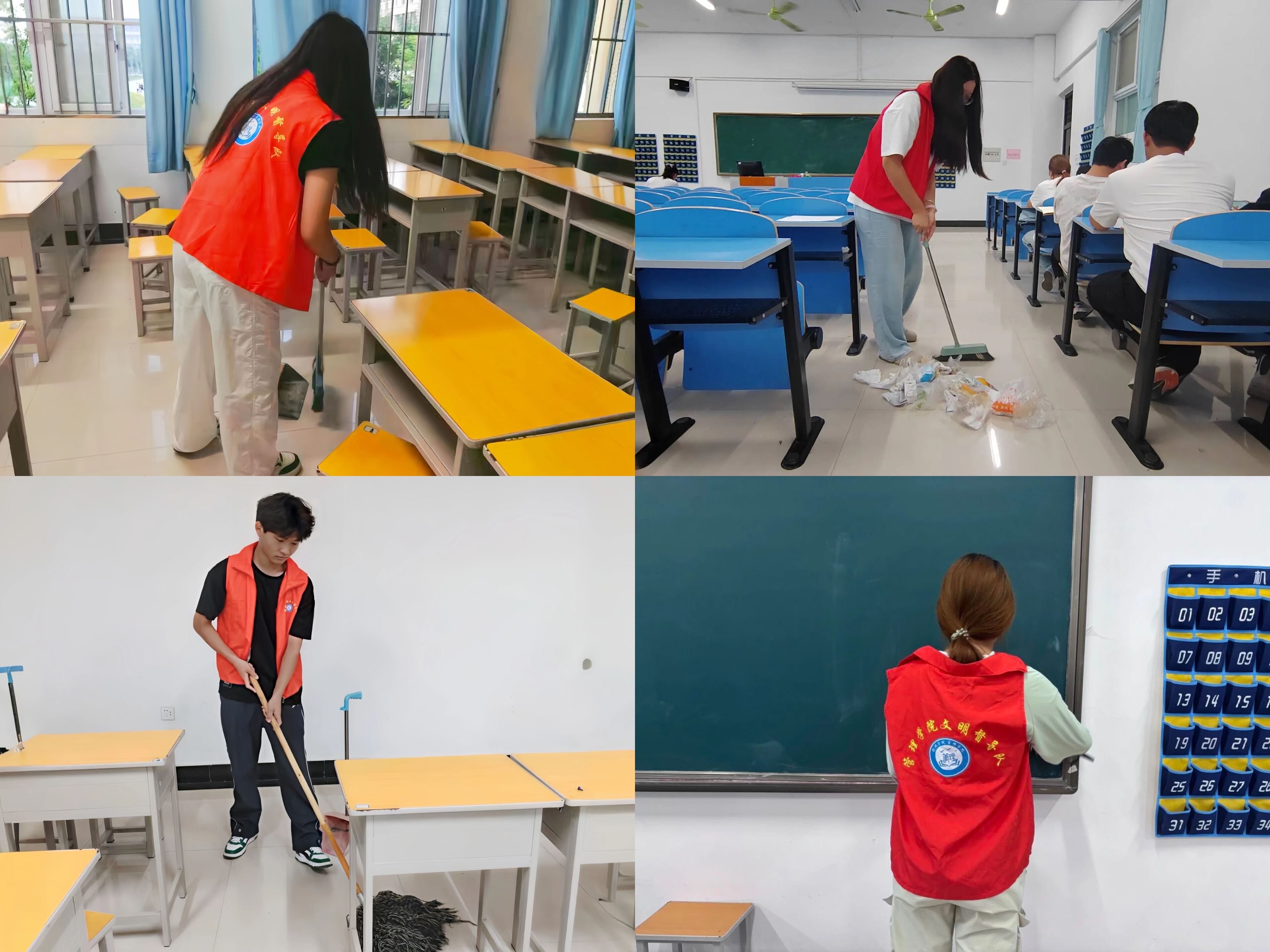 活动伊始,同学们准时集合于六栋教学楼。活动负责人分工明确后,志愿者们便各司其职,怀着热情投入到六栋教学楼清扫工作中。教室内,同学们仔细擦拭黑板,认真清扫地面纸屑,并重点清理桌椅缝隙、墙角积尘等卫生死角。大家默契配合,忙碌的身影成为教学楼内一道亮丽的风景线。