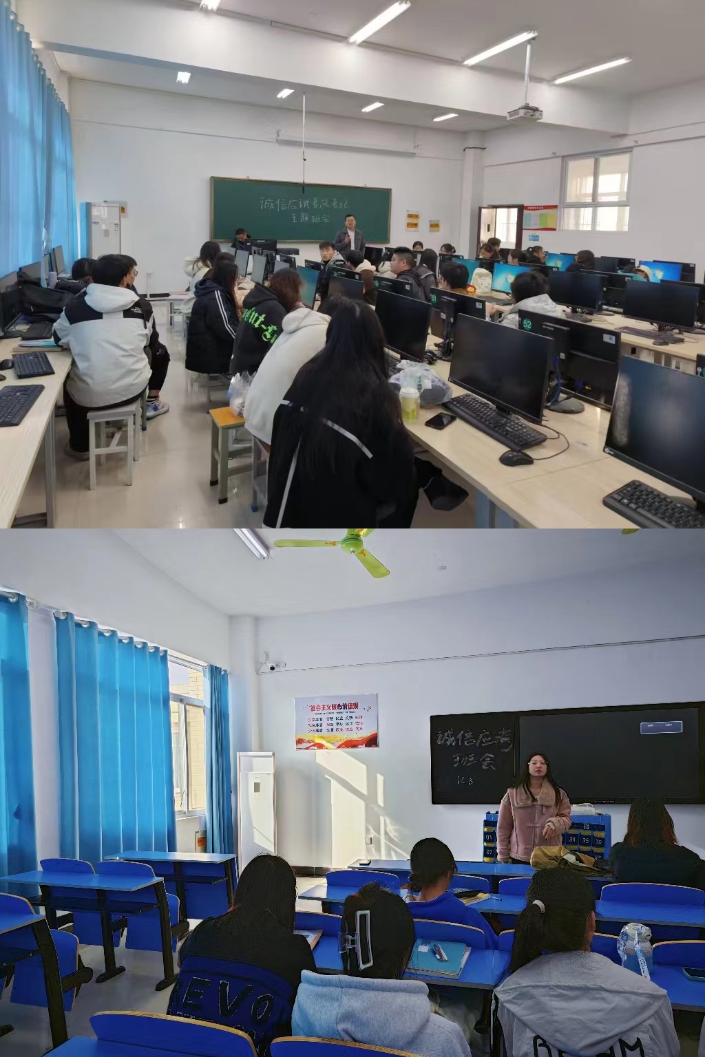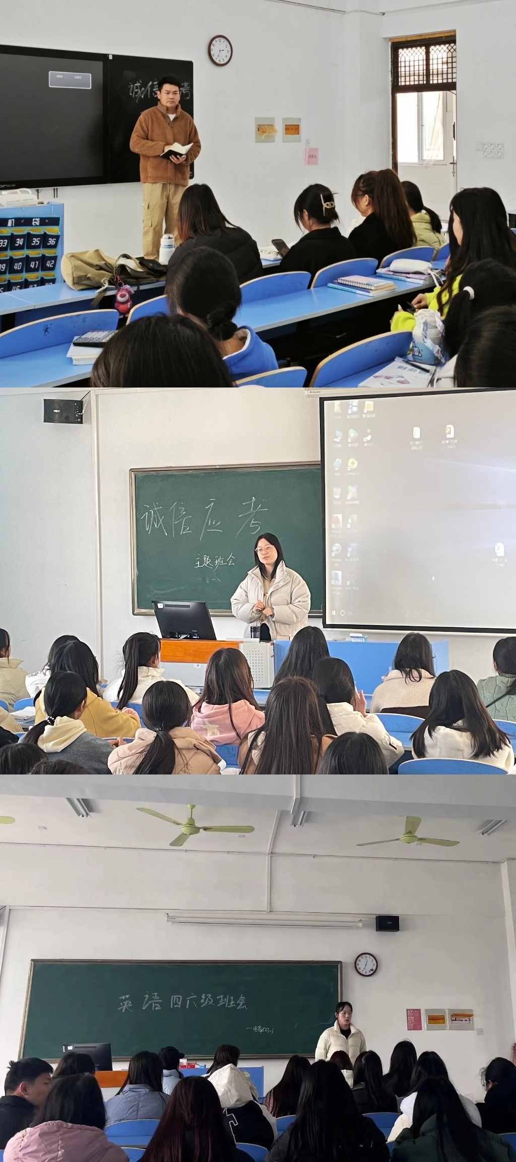 为营造良好的学风,鼓励和动员同学们积极做好英语四六级考试准备,提高同学们的诚信应考意识,激发同学们的备考热情。管理学院辅导员老师于12月8日陆续组织召开英语四六级考试诚信教育主题班会。