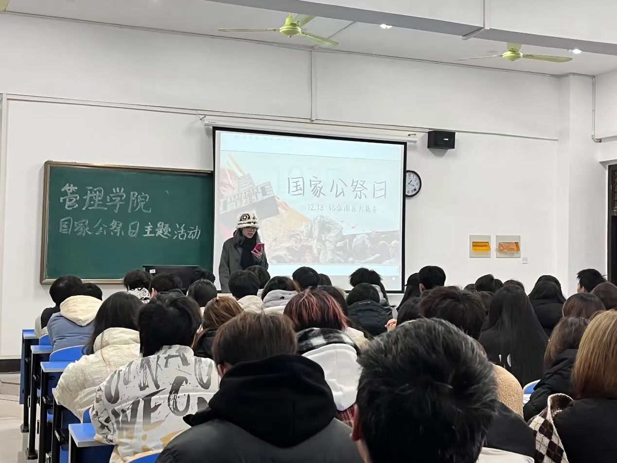 2023年12月13日,是第十个南京大屠杀死难者国家公祭日。为引导同学们铭记历史、勿忘国殇、牢记使命、砥砺前行,管理学院在6405教室开展了国家公祭日主题教育活动。