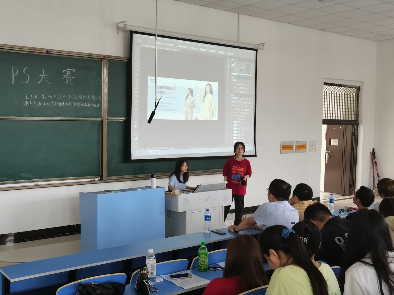 本网讯 为提升学生的视觉营销水平和电商实践能力,2021年5月15日下午,管理学院在太湖校区3105教室举办“红叶杯”第一届Photoshop设计大赛。本次大赛邀请了分院校企合作单位荆州市红叶针织服饰有限公司总经理望军、视觉总监张明明,我院电子商务专业鲁衎老师、胡雄老师和方静老师担任评委。