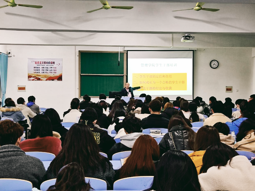 本网讯(通讯员 蹇张玥)为提升管理学院学生干部的个人素养和工作能力,进一步发挥学生干部的先锋模范带头作用,促进学生会和班集体的发展,管理学院于11月24日晚在新校区教学楼2301教室开展了学生干部专题培训。本次培训会由管理学院院长吴爱军教授主讲,党总支副书记冯尧、团总支书记李鸷、2020级带班辅导员及100余名学生干部参加了此次专题培训。