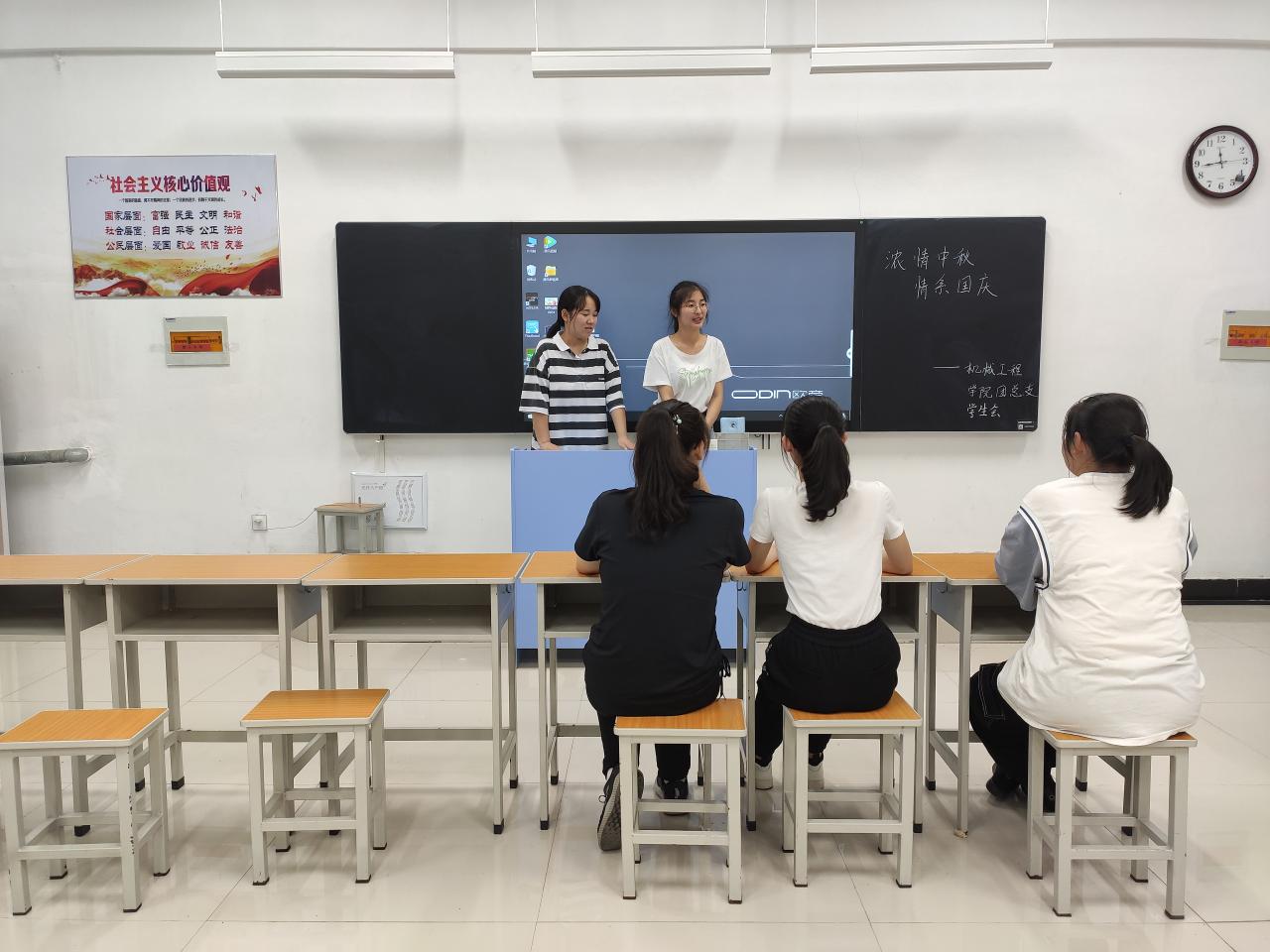 本网讯(通讯员 杜盈)为促进同学间的沟通与交流,使2020级女生尽快融入大学校园生活,让全体机械女生在中秋、国庆“双节”中感受家的温暖与关怀,10月1日晚20:30,机械工程学院在新校区教学楼2203开展了“浓情中秋,情系国庆”(双节暖女“心”)主题活动,该院19、20级全体女生参与了本次活动。