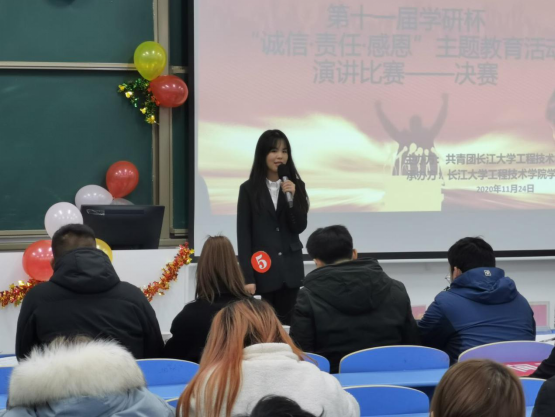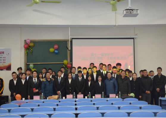 本网讯 11月24日晚上7点,我院第十一届学研杯“诚信·责任·感恩”主题教育活动之演讲比赛决赛在教学楼1301举行。担当本次活动的评委有团委书记邹发伟老师、思想政治理论课部主任胡兆凌老师、学工处副处长李鹏老师、思想政治理论课部刘国平老师、学工处李程老师、李强老师。大学生艺术团陈万里、李佳雨主持本次活动。