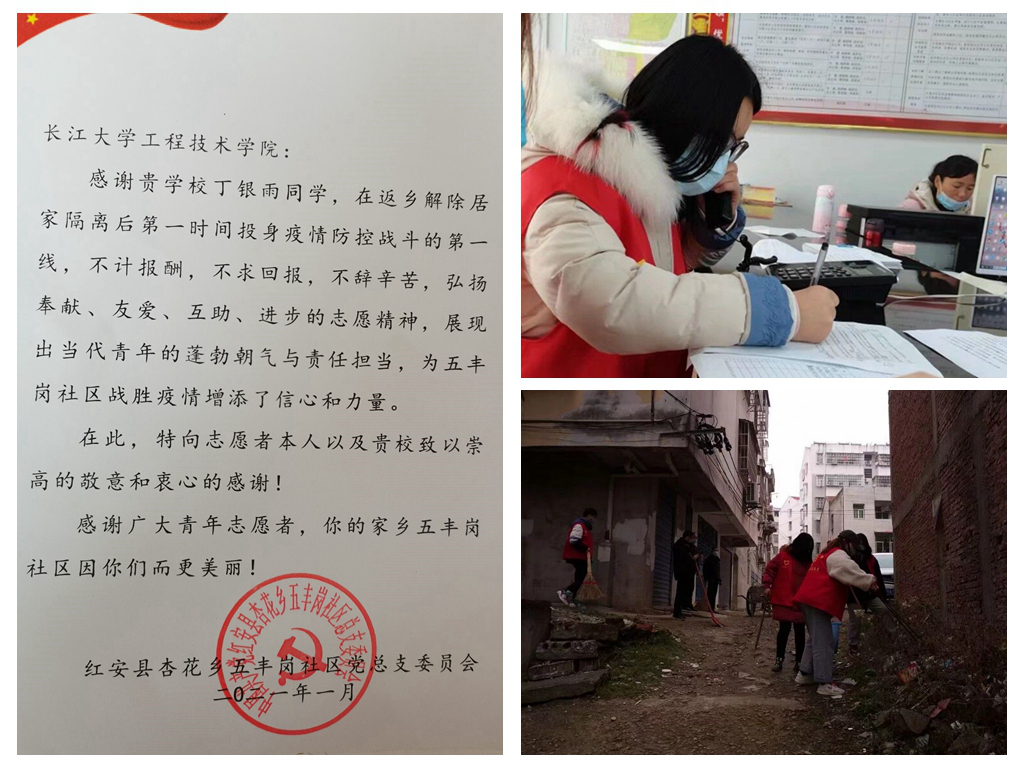 本网讯 抗击疫情仍在继续。寒假期间,外国语学院学前62004班丁银雨同学在自己的家乡红安县五丰岗社区担任社区志愿者,她优异的表现获得了社区的一致好评,特向学校发来了感谢信。