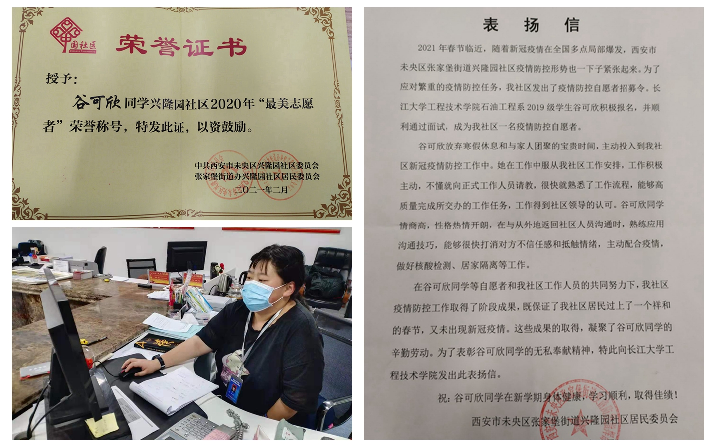 综合要闻 缤纷校园 教学科研 媒体荆院 通知公告 学术动态 石油学子谷可欣获社区“最美志愿者” 来源: 编审: 审核: 签审: 日期:2021-03-10 本网讯(记者 黄思琦)2021年春节,新冠疫情在全国多点局部爆发,石油与化学工程2019级学生谷可欣家住西安,在看到所在社区发起的疫情防控志愿者招募令后积极报名参加。她的优异表现得到社区肯定,特向我院发来感谢信,并被评为兴隆社区2020年“最美志愿者”荣誉称号。 据了解,谷可欣在社区工作期间积极主动,以热情开朗的性格、不懂就问的态度,高效保量的做好了社区核酸检测、居家隔离、政策宣传等繁杂任务,为社区居民过好年贡献力量。 上一篇: 外国语学院组织召开学生干部例会 下一篇: 学院团委召开新学期团干工作例会 返回列表页 最新文章 优企引才促就业 精准对接育新人—— WilliamHill中文官方网站... 深化榜样引领 助力考研复试——能源与化工学... 携手打造“悦动体育日” “启智砺教”再拓育人... 优企引才拓岗位 校企协同育新人——WilliamHill中文官方网站... WilliamHill中文官方网站举行禁毒、反诈专题宣讲会 筑牢校园... 健康医学院召开辅导员工作例会 传达学校精...