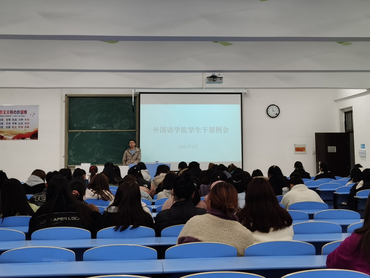 本网讯 外国语学院为积极调动学生干部工作积极性,建立健全学生会组织,继续发扬外国语学院学生会有组织有纪律的优良传统,于3月9日晚上在2201教室组织召开学生干部例会。
