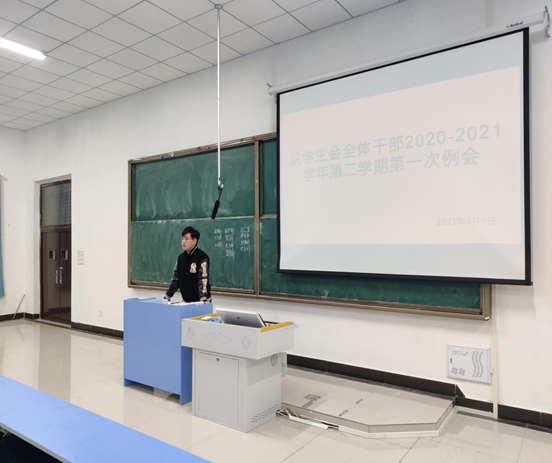 本网讯(通讯员 王学兵) 2021年3月9日,在新校区3105教室召开展了院学生会全体学生干部第一次例会,团委会、学生会全体工作人员参加会议。