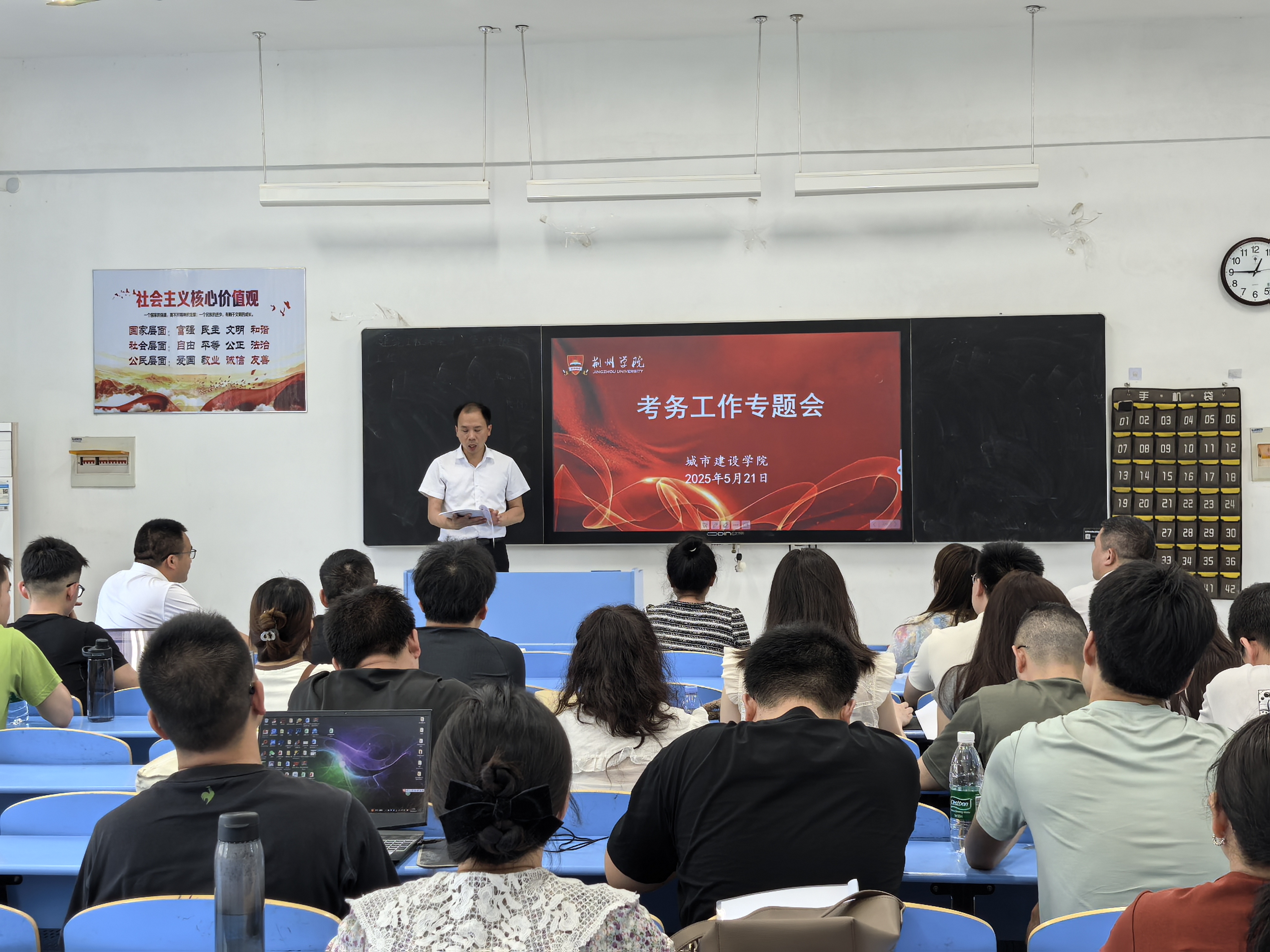 本网讯(通讯员 周瑾)为全面部署本学期期末考试工作,严肃考风考纪,确保考试公平有序进行。根据学校教务处整体工作安排,城市建设学院于5月21日在1304教室召开了2024-2025学年第二学期期末考试考务工作会议。会议由院长贺才豪主持,全体教职工参会,教务处李紫微老师受邀参加。