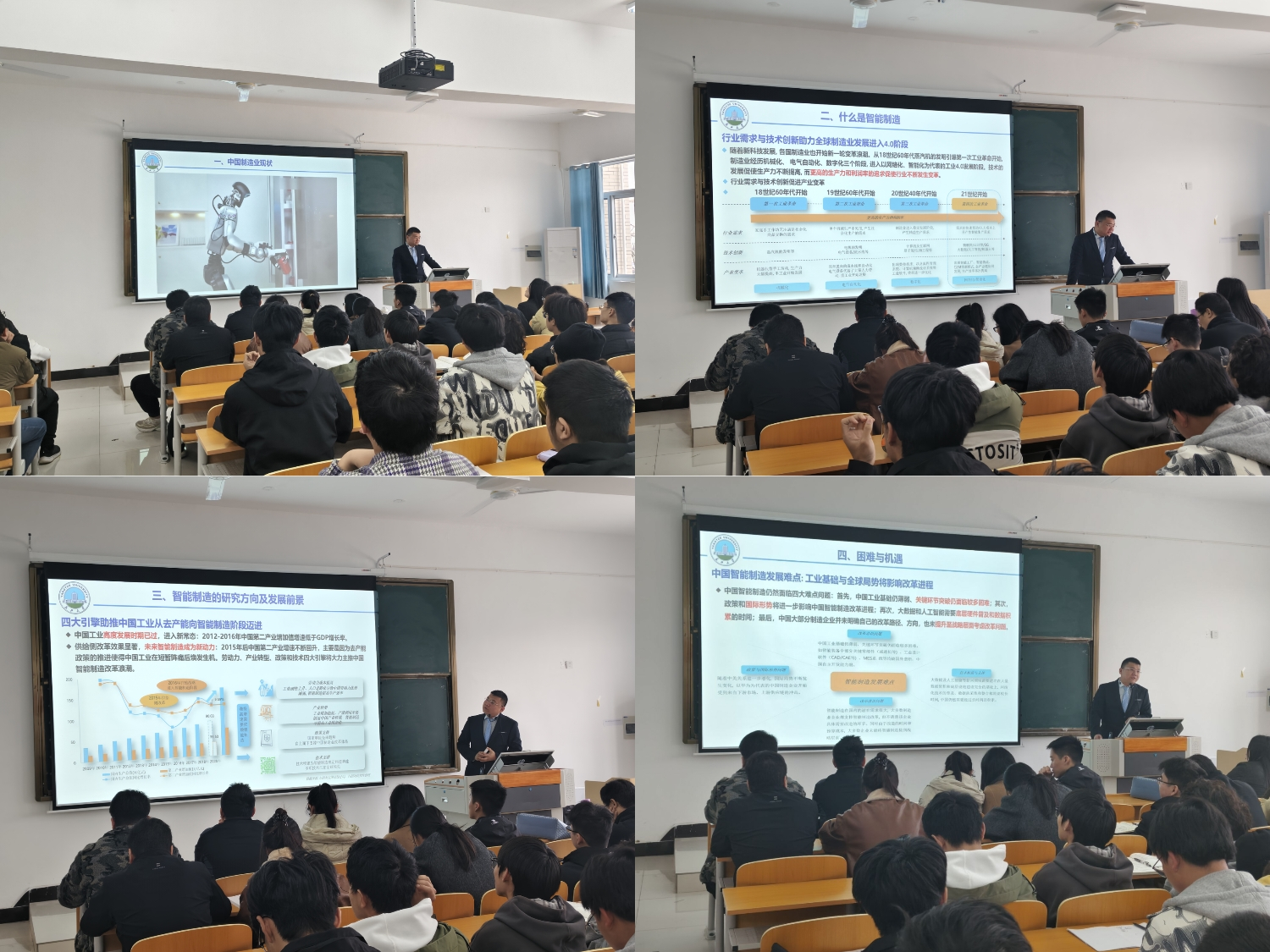 施雷副教授深情回顾了在母校的学习时光,并迅速切入专业主题。他紧密结合自身研究与实践,从智能优化、自主决策、数字化柔性转型、未来融合趋势四个维度,系统阐述了AI技术在智能制造领域的核心作用与应用路径。讲座中,他通过展示智能质检、预测性维护、柔性生产线调度等生动案例,直观揭示了AI如何深度优化生产流程、提升设备智能化水平,从而赋能制造业向高效、精准、自适应方向变革。