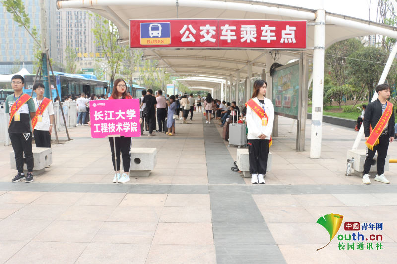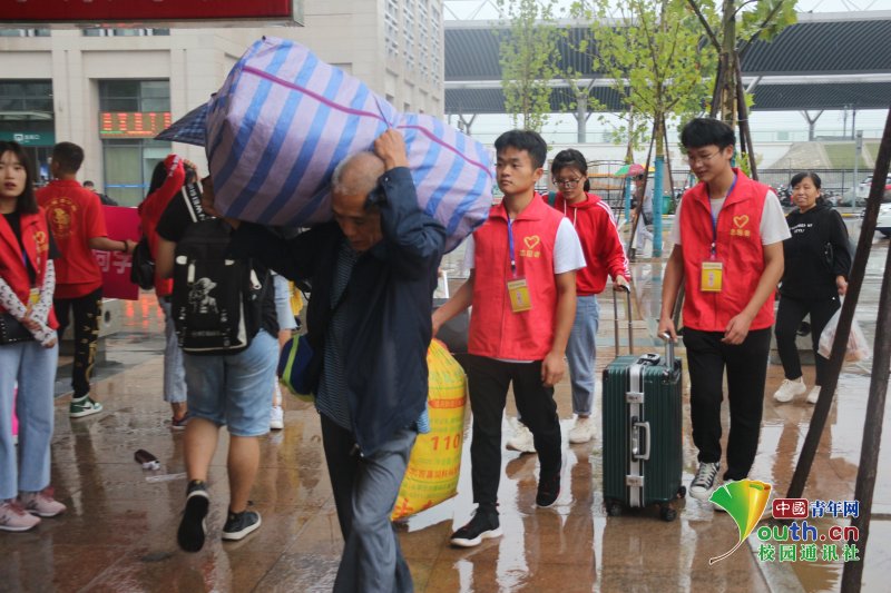 图为长江大学工程技术学院志愿者在荆州火车站迎接新生。 中国青年网通讯员 何维维 摄