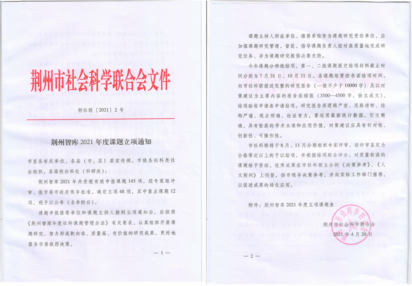 综合要闻 缤纷校园 教学科研 媒体荆院 通知公告 学术动态 【科研动态】我院获批荆州智库2021年度立项课题3项 来源: 编审: 审核: 签审: 日期:2021-05-08 本网讯 近日,从荆州市社科联获悉,荆州智库2021年度课题立项评审工作已经结束。经专家评审,市委市政府批准,我院组织申报的课题共有3项获批。望各课题负责人高度重视,严格按照课题管理办法的要求,认真组织开展研究,深入调研,突出围绕中心、服务大局,紧贴实际,恪守学术规范,严格按结项批次按质完成课题研究。 上一篇: 关于开展2021年上半年学院科研成果统计工作的通知 下一篇: 关于转发《省教育厅办公室关于2021年度教育改革发展专项课题申报工作的通知》的通知 返回列表页 最新文章 关于举办WilliamHill中文官方网站学术沙龙第二十八期的通知 关于举办“荆院楚风”学术讲坛第二十八期的通... 关于举办“荆院楚风”学术讲坛第二十七讲的通... 关于举办WilliamHill中文官方网站学术沙龙第二十六期的通知 关于举办“荆院楚风”学术讲坛第二十六期的通... 关于举办WilliamHill中文官方网站第二十五期学术沙龙的通知