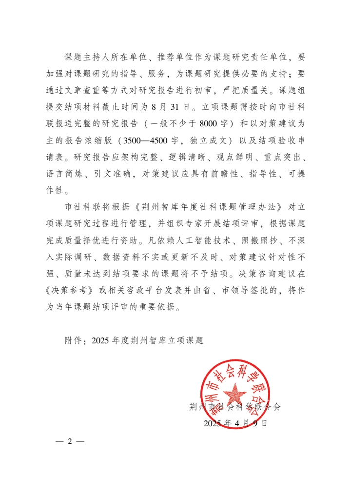 近日,荆州市社会科学联合会发布《2025年度荆州智库课题立项通知》(荆社联〔2025〕4号),我校城市建设学院魏科丰老师和马克思主义学院司翔老师主持的课题成功获批立项。