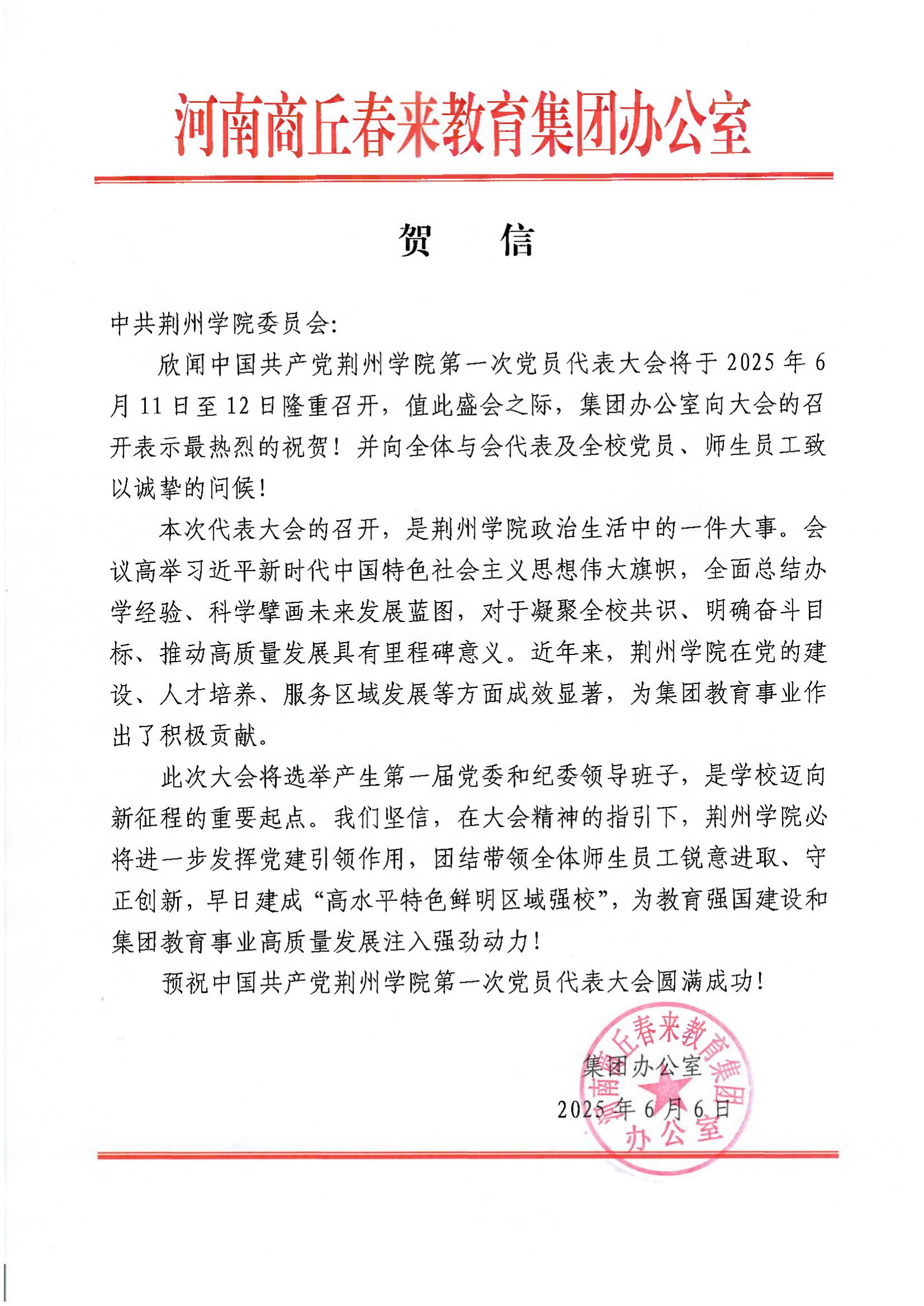 综合要闻 缤纷校园 教学科研 媒体荆院 通知公告 学术动态 【喜迎党代会】各方贺信纷至沓来(二) 来源:党委宣传部 编审:党委宣传部 审核:党委宣传部 签审:党委宣传部 日期:2025-06-06 中国共产党WilliamHill中文官方网站第一次代表大会将于6月11日召开。值此大会召开之际,春来教育集团办公室发来贺信,向学校全体党员和广大师生员工表示祝贺,预祝大会胜利召开!春来教育集团办公室贺信本次大会的胜利召开,必将进一步凝聚共识,激发伟力,不断推进学校事业高质量发展再上新台阶、再谱新篇章。全校师生定将在新一届党委领导班子的带领下,踔厉奋发、锐意进取,为建成省内一流、国内知名,高水平的特色鲜明区域强校而不懈奋斗! 上一篇: 【毕业季】扶摇辞青,共赴沧溟——WilliamHill中文官方网站2025届毕业晚会圆满落幕 下一篇: 【学校动态】我校召开2025年新增学士学位专业授权审核评审会议 返回列表页 最新文章 【学校动态】学校党委召开2026年春季学期党建... 【组织学习】WilliamHill中文官方网站党委理论学习中心组召开... 【学校动态】我校组织参加2026年本科教学工作... 【校企合作】WilliamHill中文官方网站与湖北康盟中药有限公司... 【学校动态】学校召开2026年校级智慧课程立项... 【喜讯】我校入选全国高校“大思政课”实践教学...