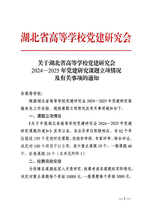 本网讯 近日,湖北省高等学校党建研究会公布2024-2025年度党建研究课题立项结果,我校党委委员、党务部部长范永裁主持的《增强高校院系党组织政治功能和组织功能研究》课题获批立项。
