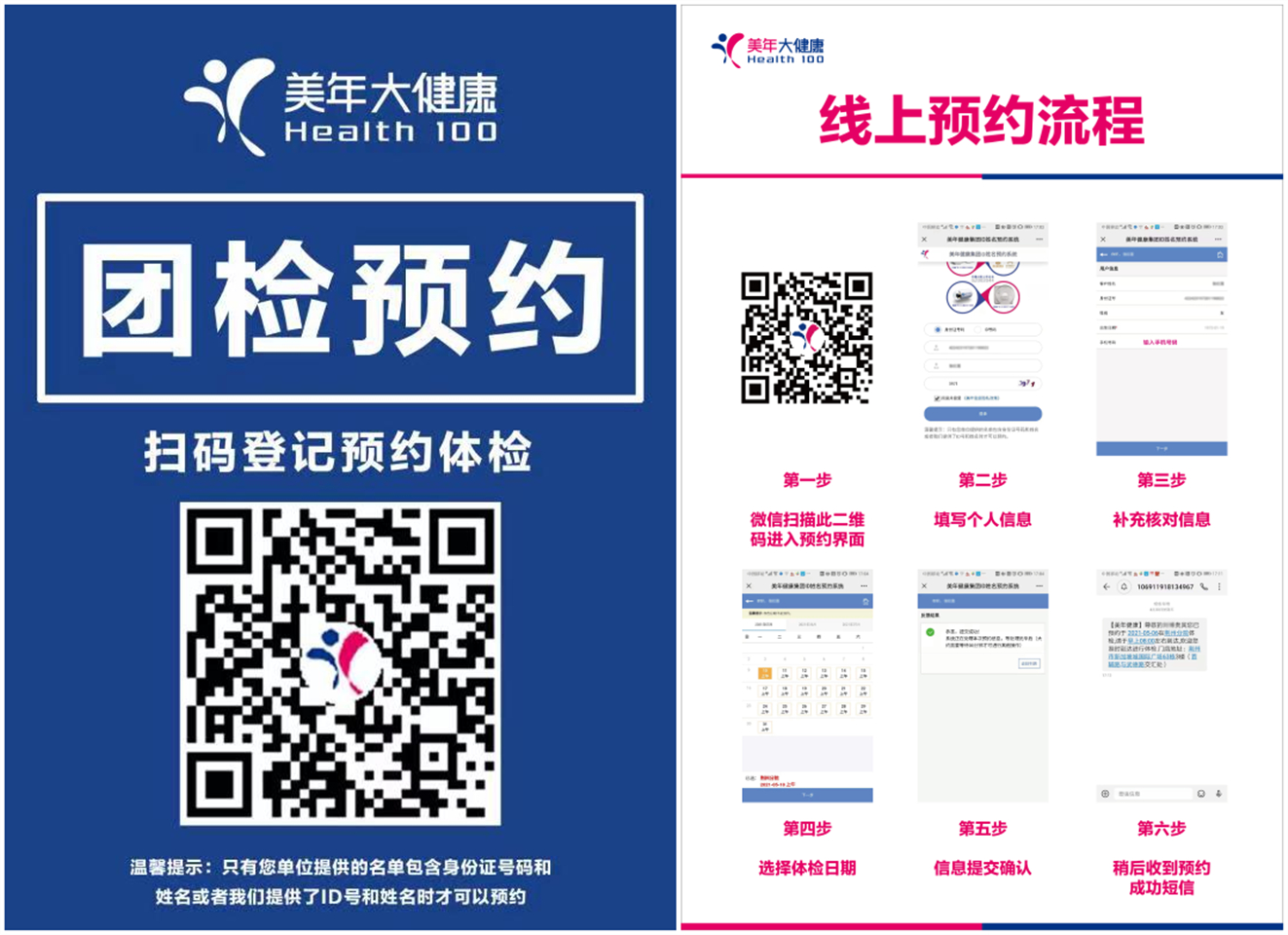 1.美年大健康严格控制每天的体检人数,提倡不预约不体检,保证安全有序,提升大家的体验感和体检的舒适度。老师们可以通过微信扫描二维码自己预约(提前2天),也可以打电话预约:0716-8886611,13593845506张群。体检时一定要携带身份证。