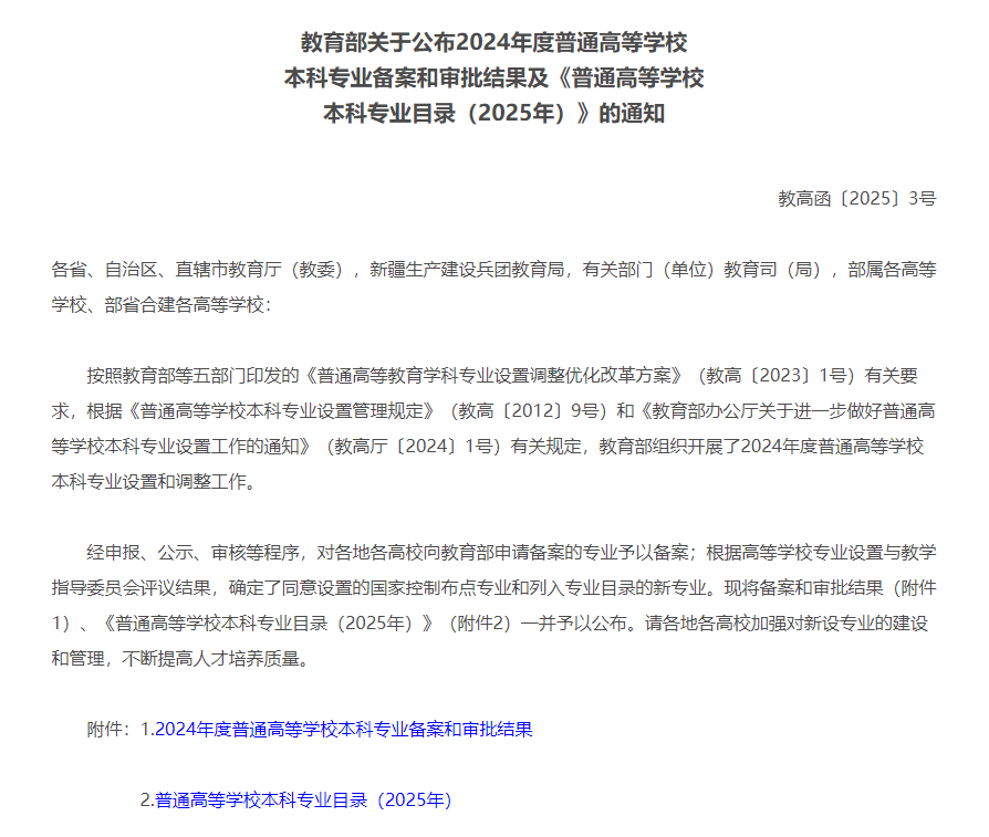 近日,教育部正式发布《关于公布2024年度普通高等学校本科专业备案和审批结果及〈普通高等学校本科专业目录(2025年)〉的通知》(教高函〔2025〕3号),我校申报的网络与新媒体、智能制造工程、智能建造、医学检验技术、音乐表演5个本科专业成功获批。同时,我校申报的智能产品开发与应用、中医康复技术2个专科专业也在省教育厅获批备案。