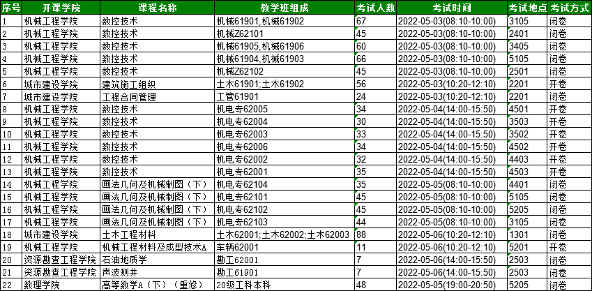 2021-2022学年第二学期期末考试安排(第10周)
