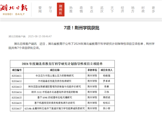 获批项目涵盖中主应力对挡土墙土压力的影响研究、木材高温后性能及损伤检测研究、转向压裂自降解凝胶暂堵剂的制备与性能评价、纳米SiO₂对低油水比油基钻井液性能的影响、基于HPWG的硅基布拉格光栅研究、基于机器视觉的焦炭粒度检测方法研究、42CrMo金属材料石油井下高温环境力学性能衰减系数研究等多个前沿领域。这些课题紧密围绕土木工程、新材料、石油工程、光电子技术与智能检测等方向,着力响应荆州本地产业升级与技术需求,突出体现学校应用型科研的鲜明特色与创新潜力。