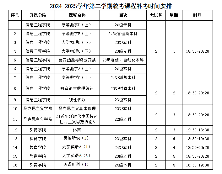 根据学校教学工作安排,2024-2025学年第二学期开学初,各开课院应对2024-2025学年第一学期理论课程考核不及格的学生组织补考,为了使补考工作顺利进行,现将有关事项通知如下: