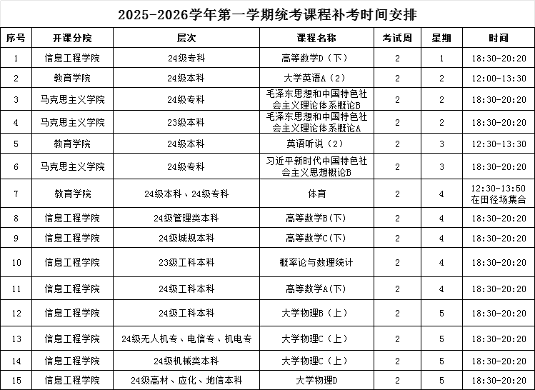 根据学校教学工作安排,2025-2026学年第一学期开学初,各开课院应对2024-2025学年第二学期理论课程考核不及格的学生组织补考,为了使补考工作顺利进行,现将有关事项通知如下: