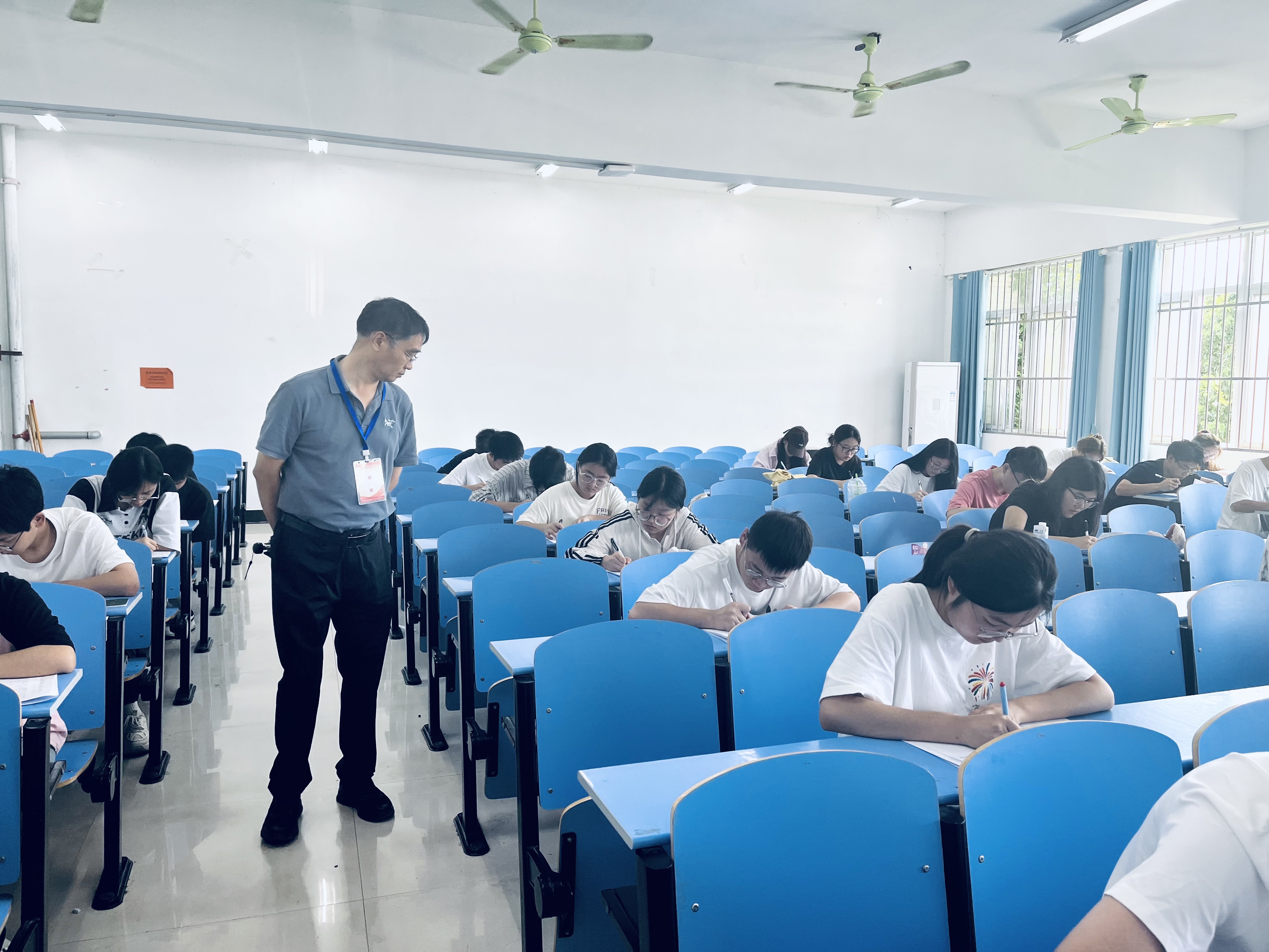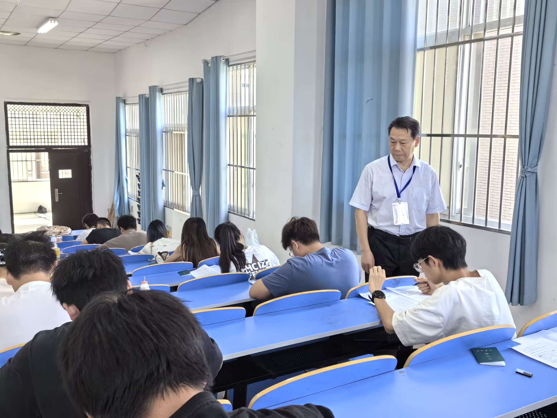 为进一步加强考风考纪建设,严肃考试纪律,确保期末考试工作规范有序进行,6月24日下午,校长戴国强、副校长聂好春、刘瑾带领教务处、教促办负责人组成巡考组,对全校期末考试考场进行了全面巡查。