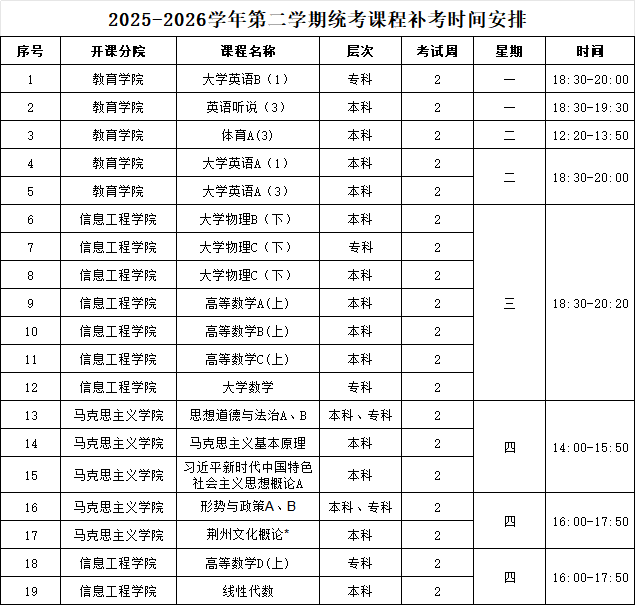 根据学校教学工作安排,2025-2026学年第学期开学初,各开课院应对2025-2026学年第学期理论课程考核不及格的学生组织补考,为了使补考工作顺利进行,现将有关事项通知如下: