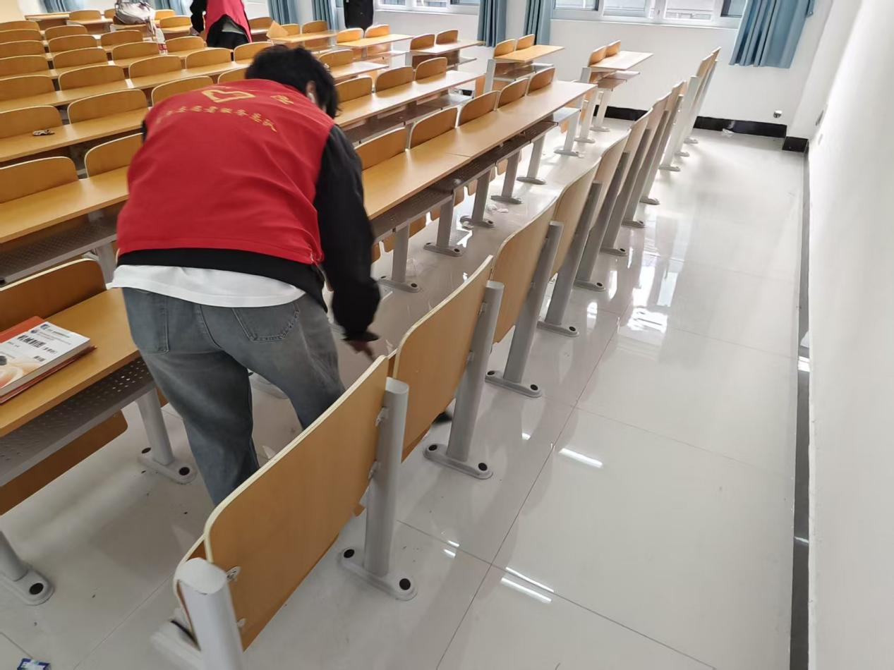 行动当天,七栋教学楼内清洁有序推进:同学们清扫大厅、楼梯间地面与缝隙灰尘,擦拭扶手、宣传栏及门禁面板;同步规整公共区域物品,以高效协作让楼内楼外焕然一新。