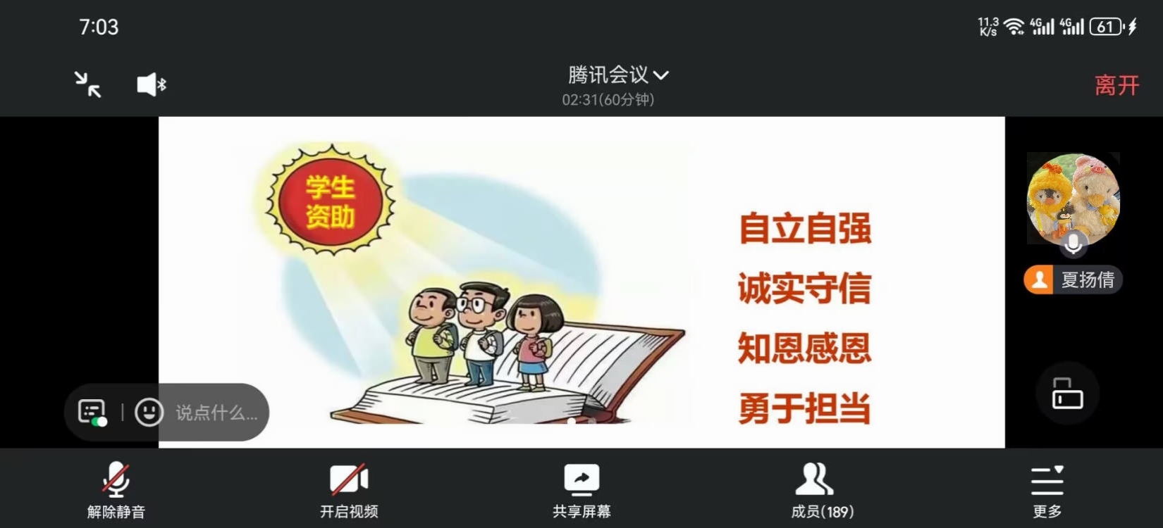 为全面落实国家资助政策,帮助学生进一步了解资助政策,同时增强受资助学生的社会责任意识,2024年1月15日,智能制造学院辅导员夏扬倩开展线上学生资助政策宣传会。