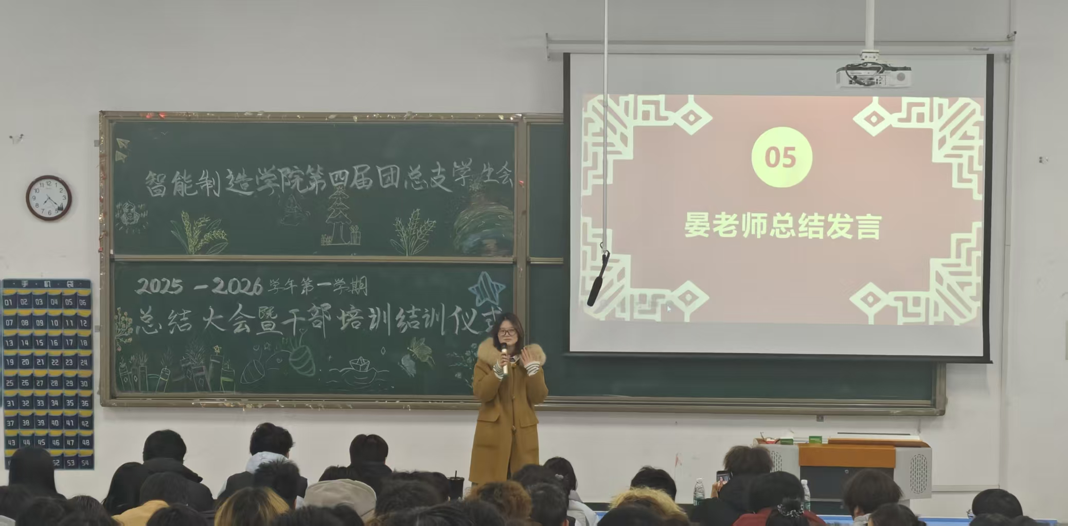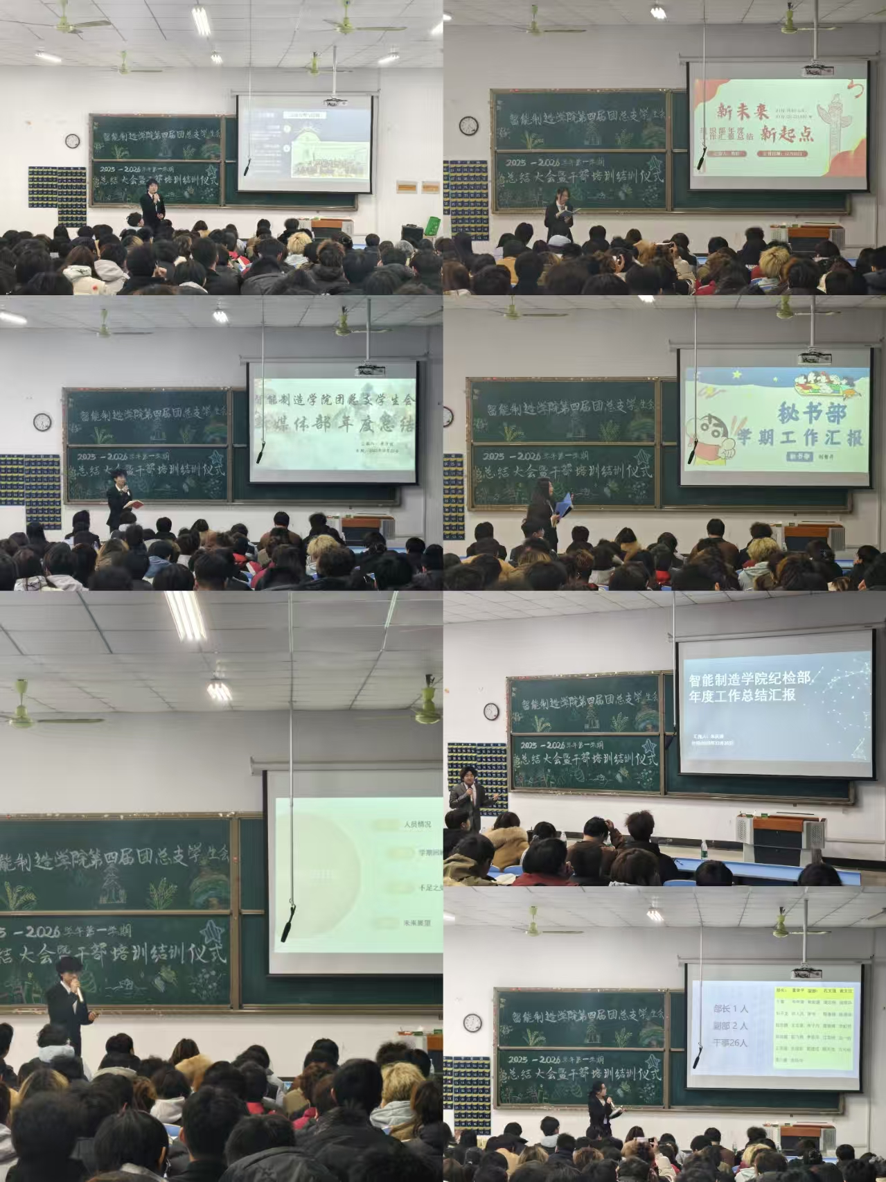 本网讯(通讯员 温雨鑫)12月25日晚,智能制造学院团总支学生会2025-2026学年第一学期总结大会暨学生干部培训结训仪式在教学楼5205教室隆重举行。学院团总支书记晏学渊及辅导员吴昙、舒长敏出席活动。会议由副主席张子健主持,全体学生会成员参会,共同回顾学期工作成果,展望未来发展蓝图。