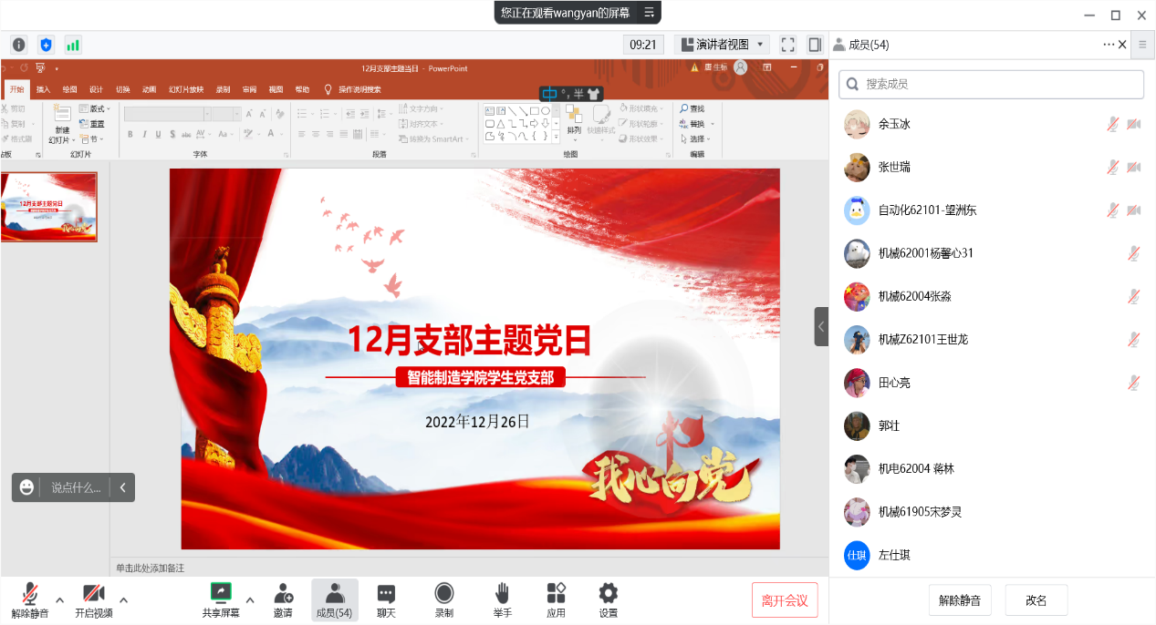 12月26日下午15:00,智能制造学院学生党支部在腾讯会议平台线上开展了12月的支部主题党日活动。支部全体党员参加,活动由智能制造学院党总支书记王艳老师主持。