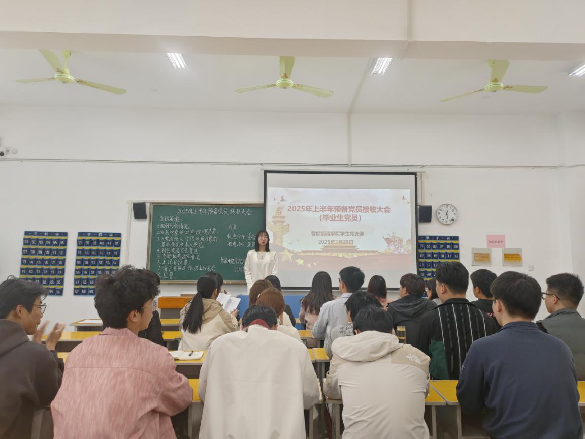 (本网讯) 2025年3月25日中午12:15,智能制造学院学生党支部于教学楼6205召开了2025年毕业生预备党员接收大会。智能制造学院学生党支部全体党员参加会议。会议由党支部书记雷倩主持。